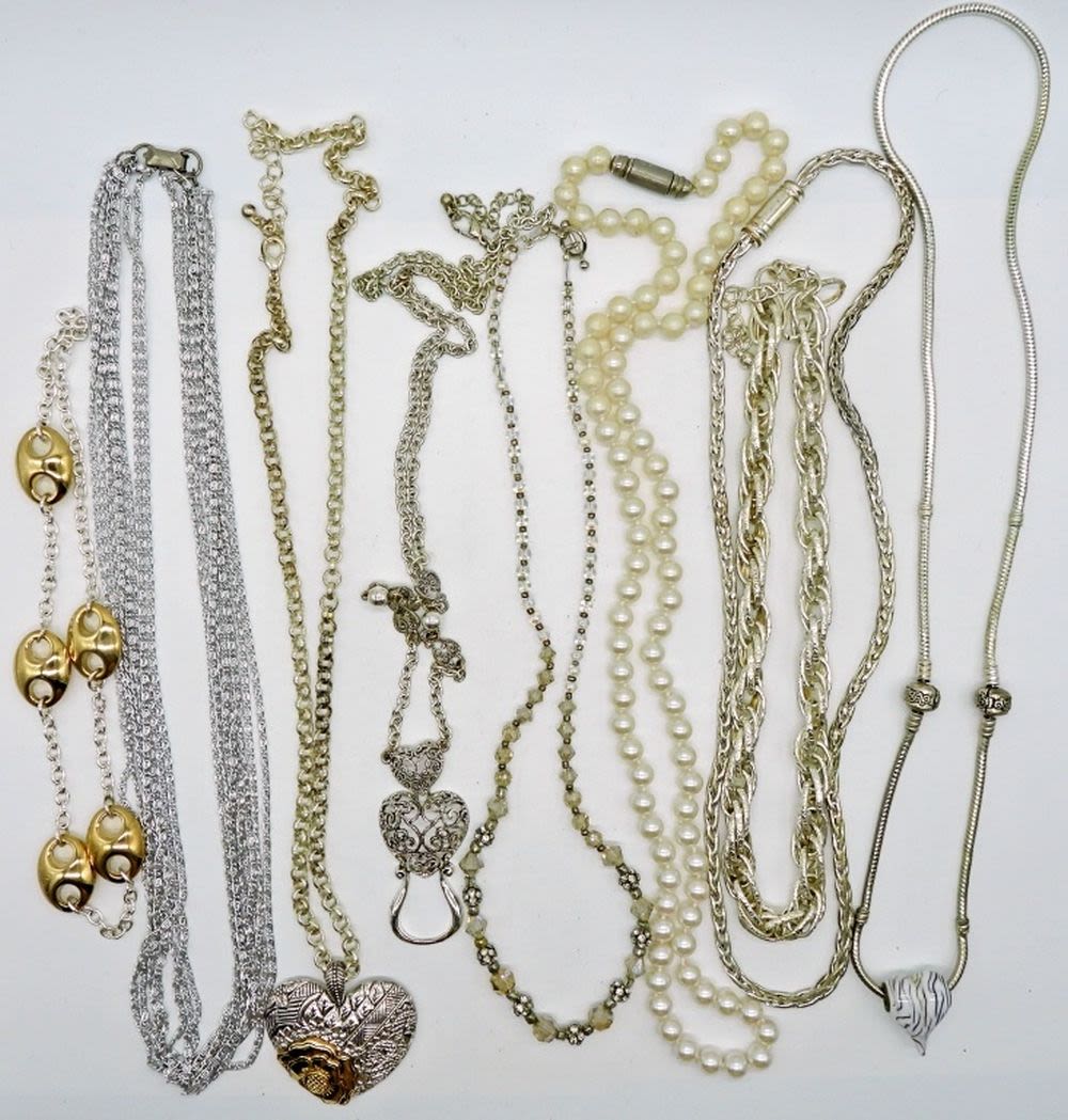 Silver tone, faux pearl, heart motif, and more. Various lengths short to long. This lot is very pretty!