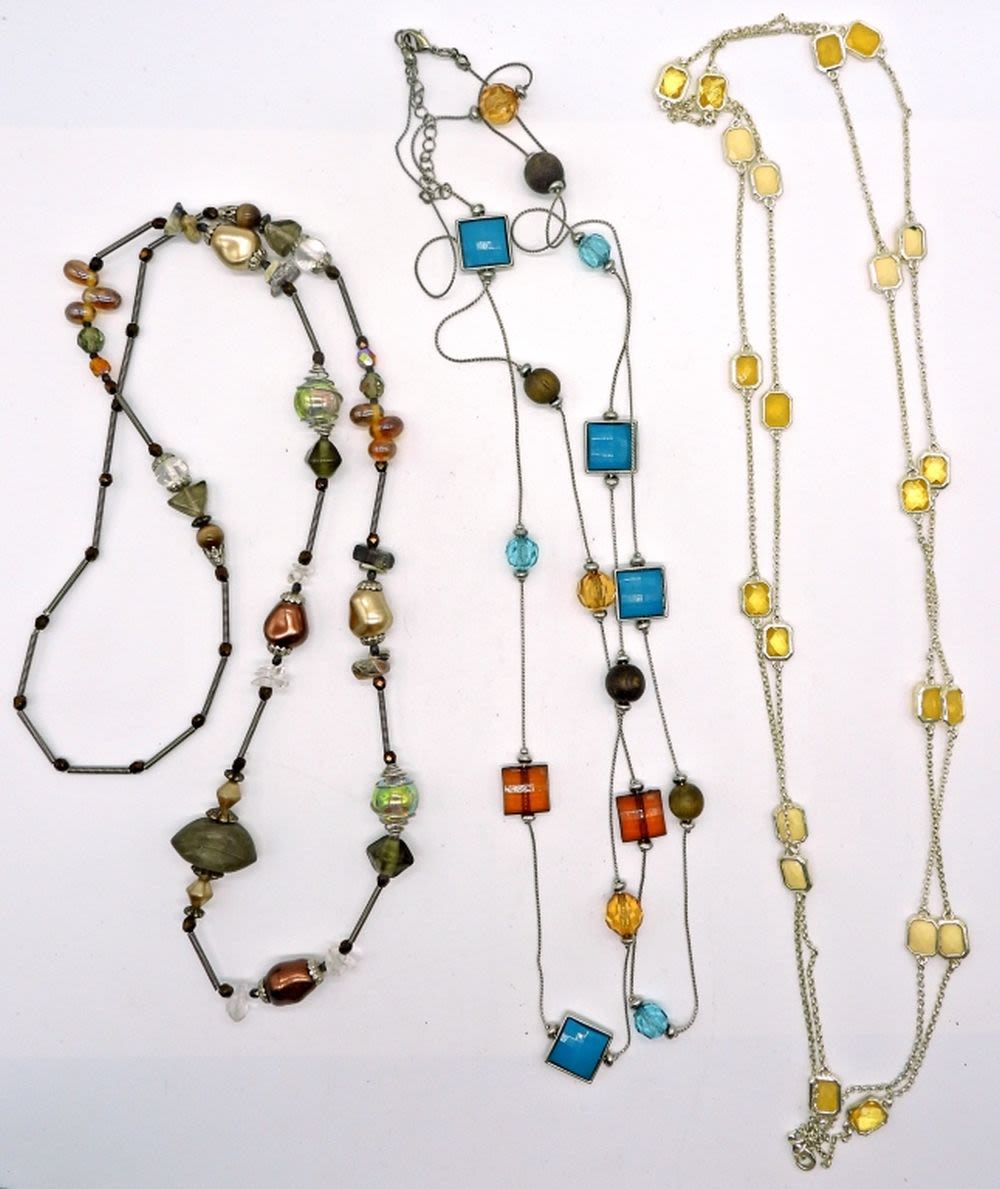 Three long necklaces 36-60 inches in blues, greens, tans, and browns.