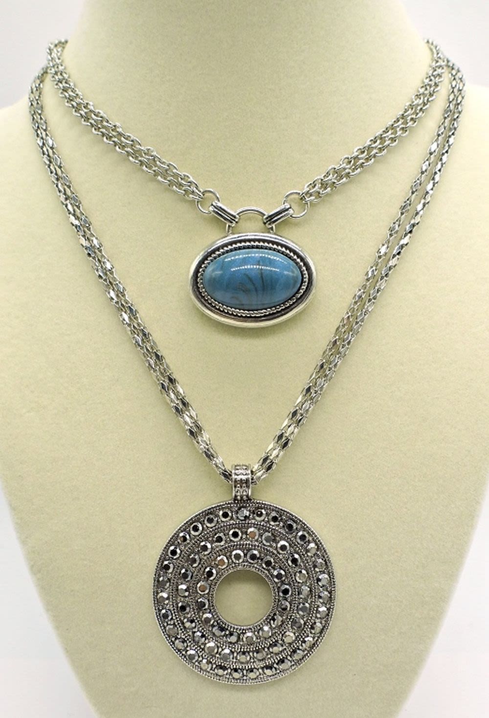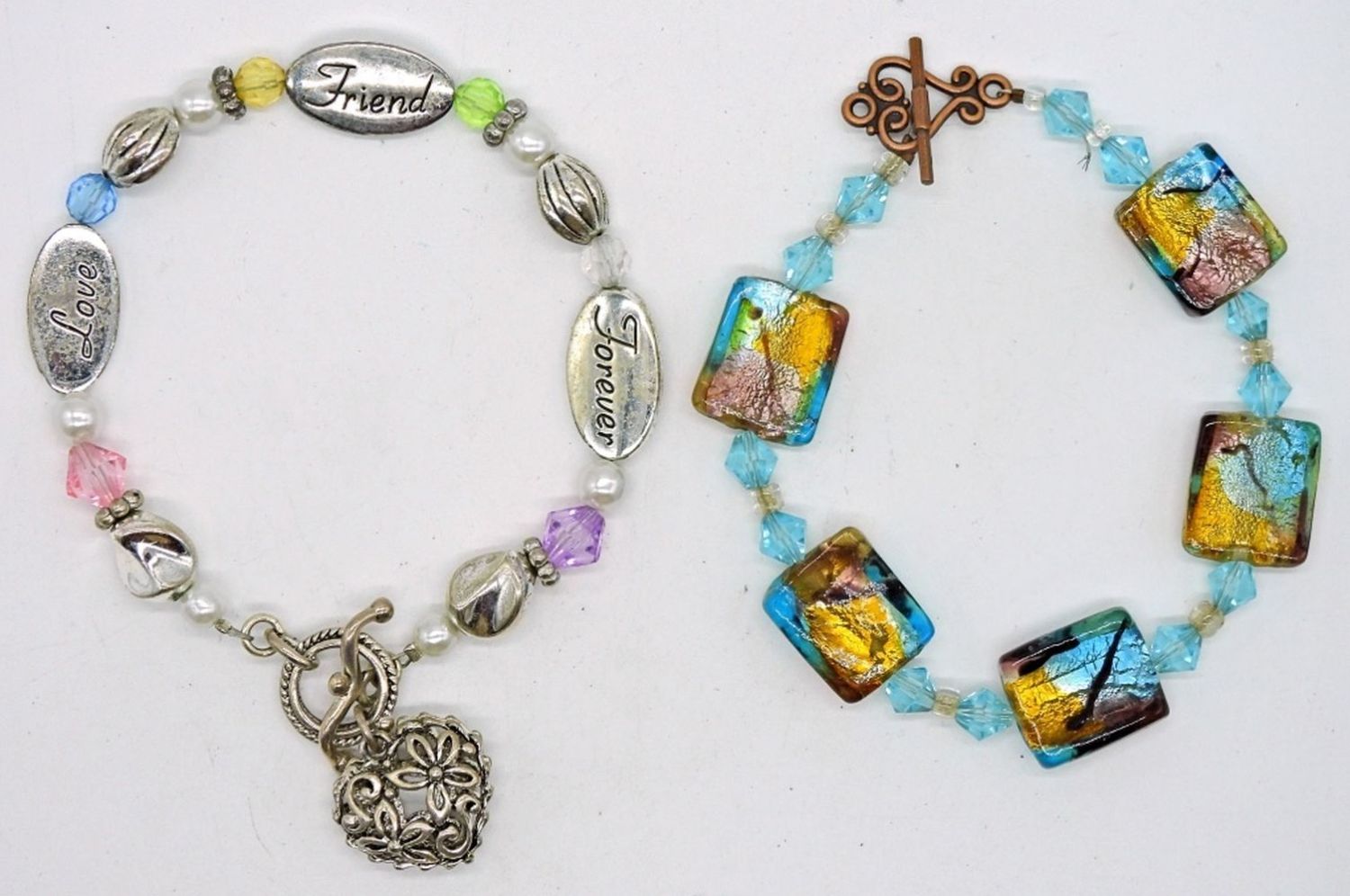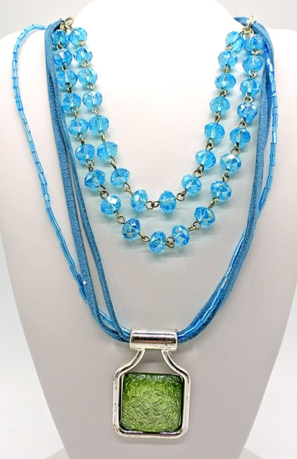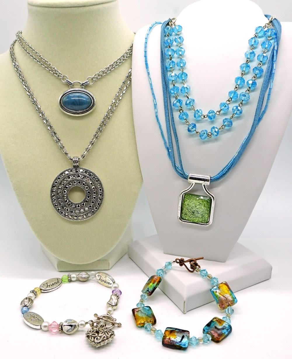 Four necklaces in short lengths 16-18 inches in turquoise, green and silver tone colors. Two 7 inch bracelets in complimentary colors.