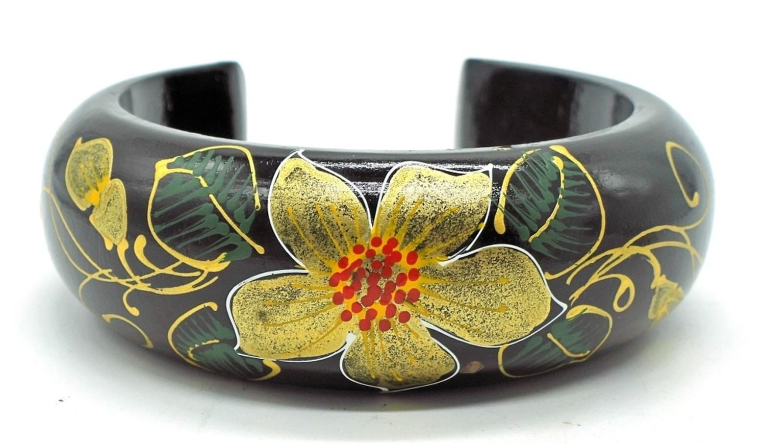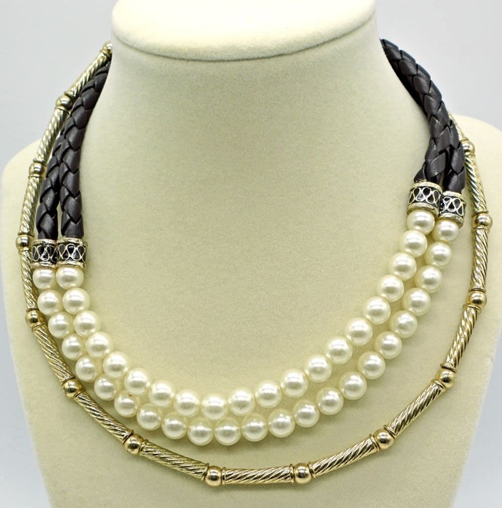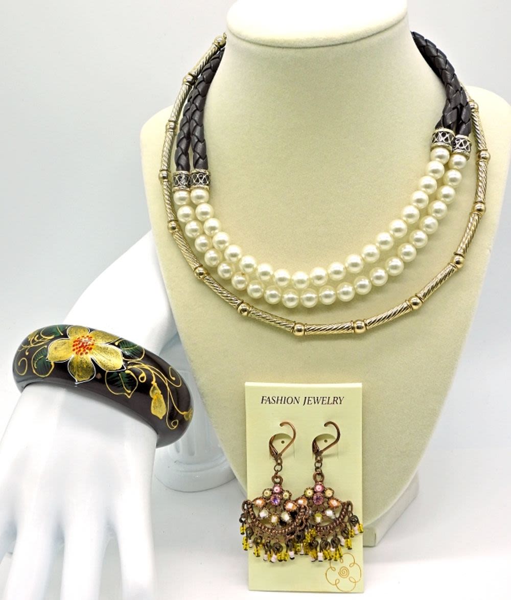 Black cuff bracelet with painted flower motif, two choker style necklaces, faux pearl & leather, and one metal bead.