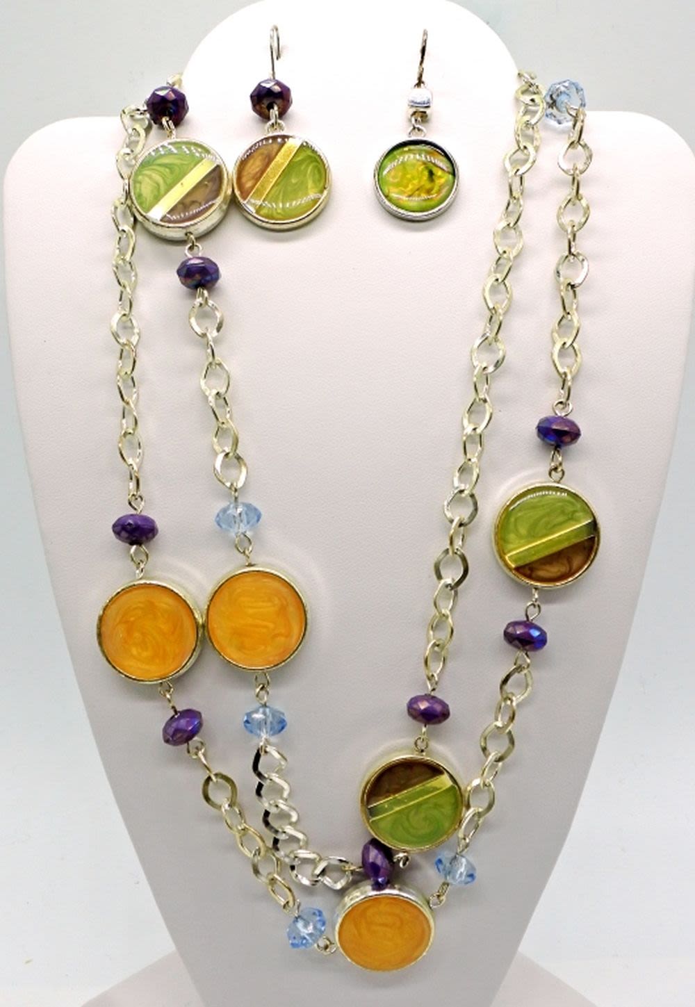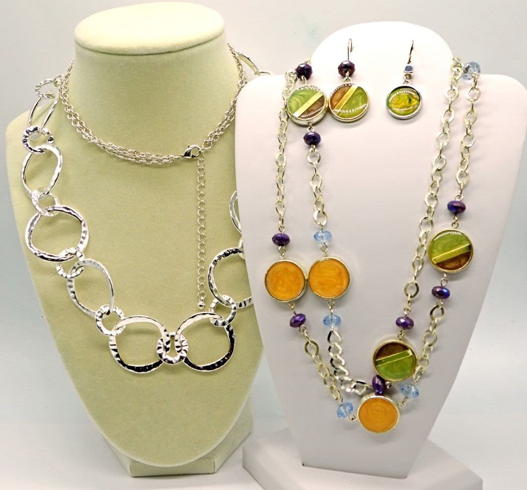 Hammered rings necklace 28 inches, resin bead necklace 34 inches with matching earrings.