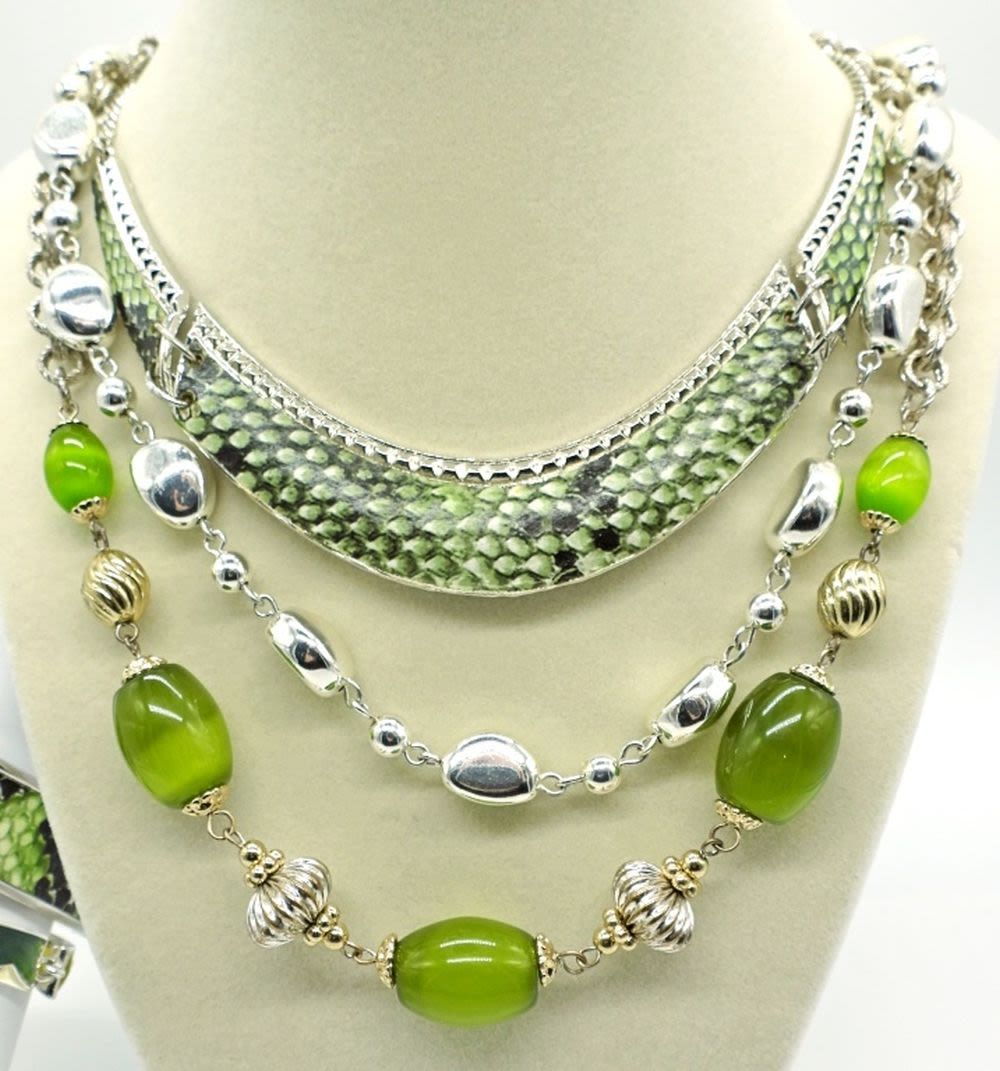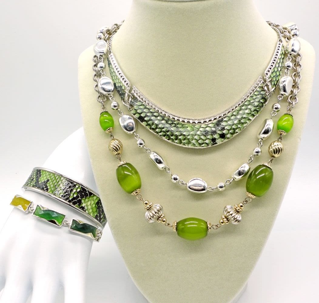 Three necklaces 15-17 inches long. 7 inch clasp bracelet and one bangle bracelet. Very nice lot!