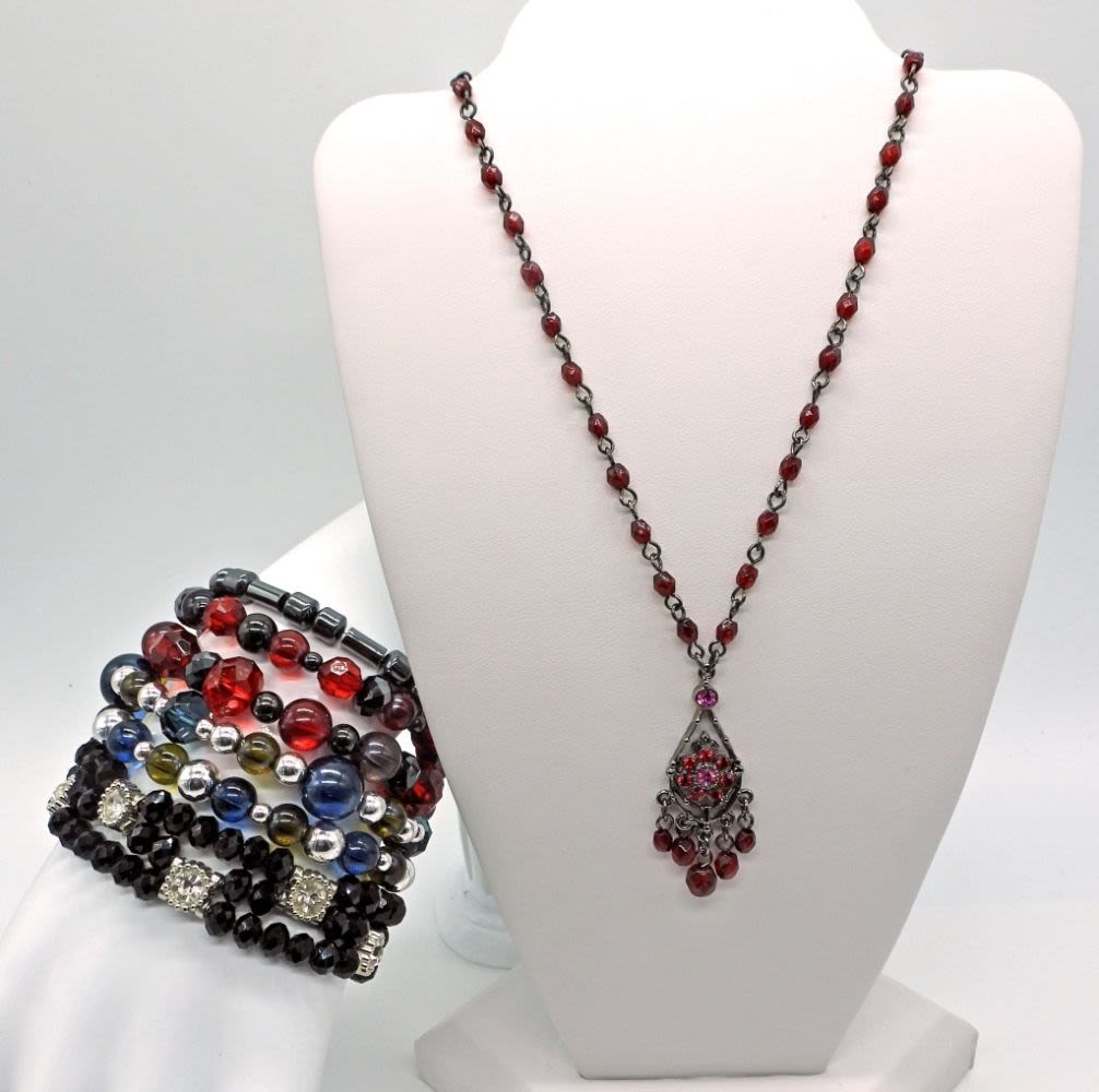 6 stretch bracelets in black, red, and blue. Beaded necklace 16 inches with extender.