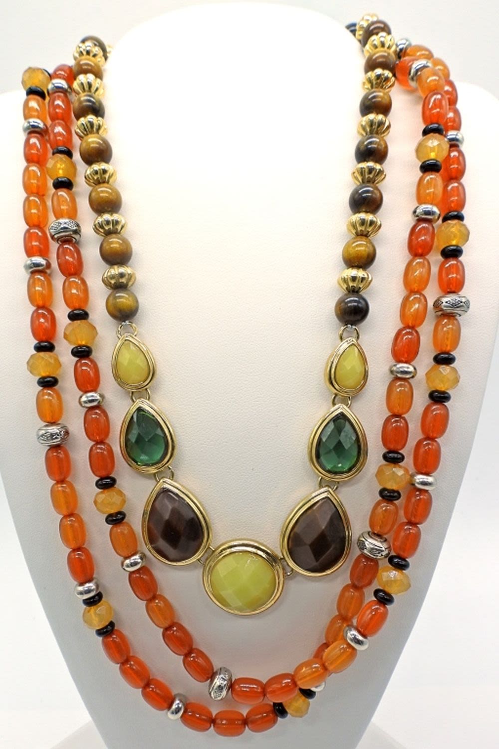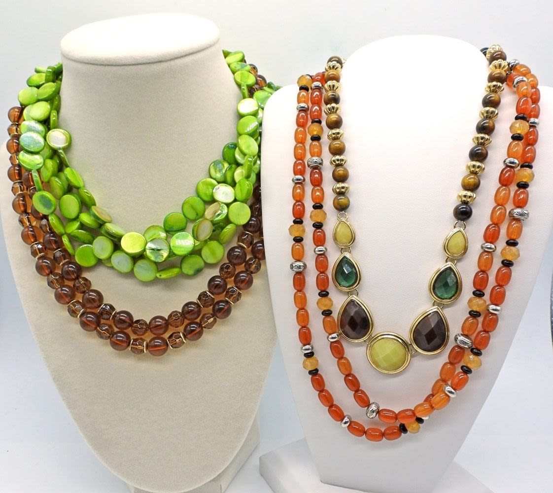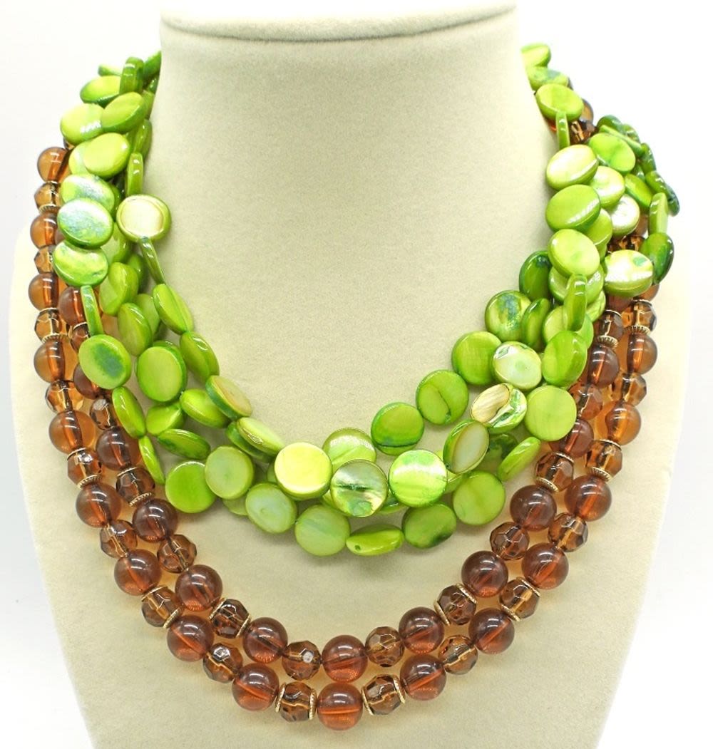 16-18 inches long. Green shell, brown bead, and orange beads. Fun set!