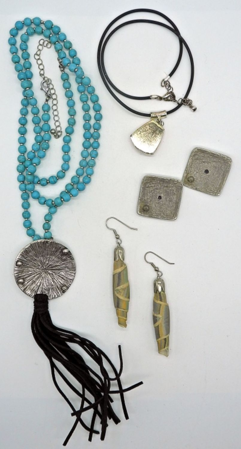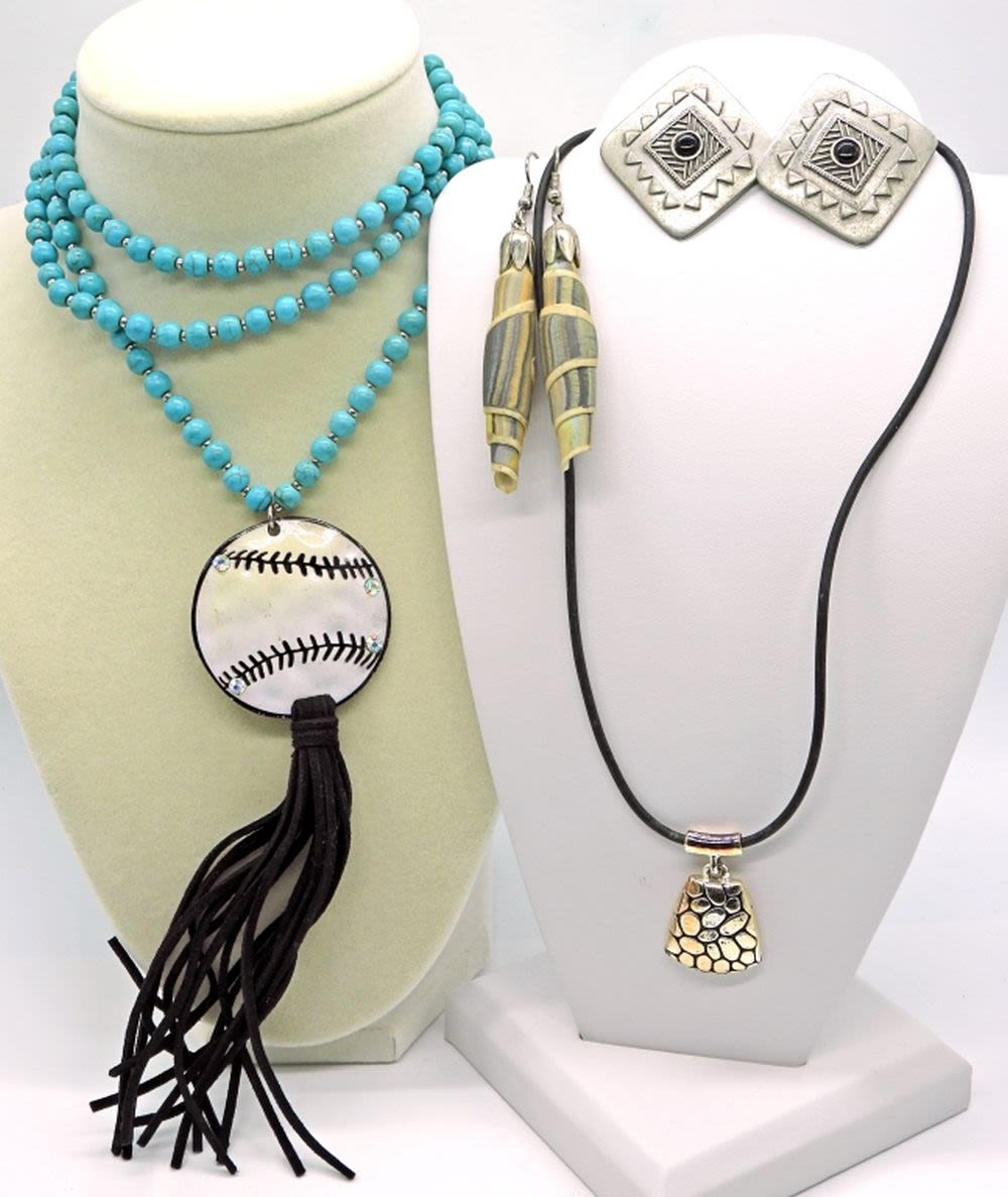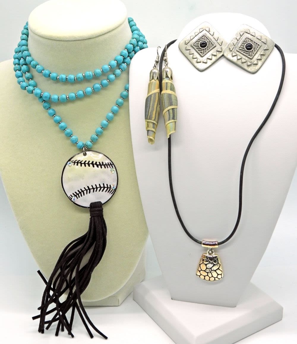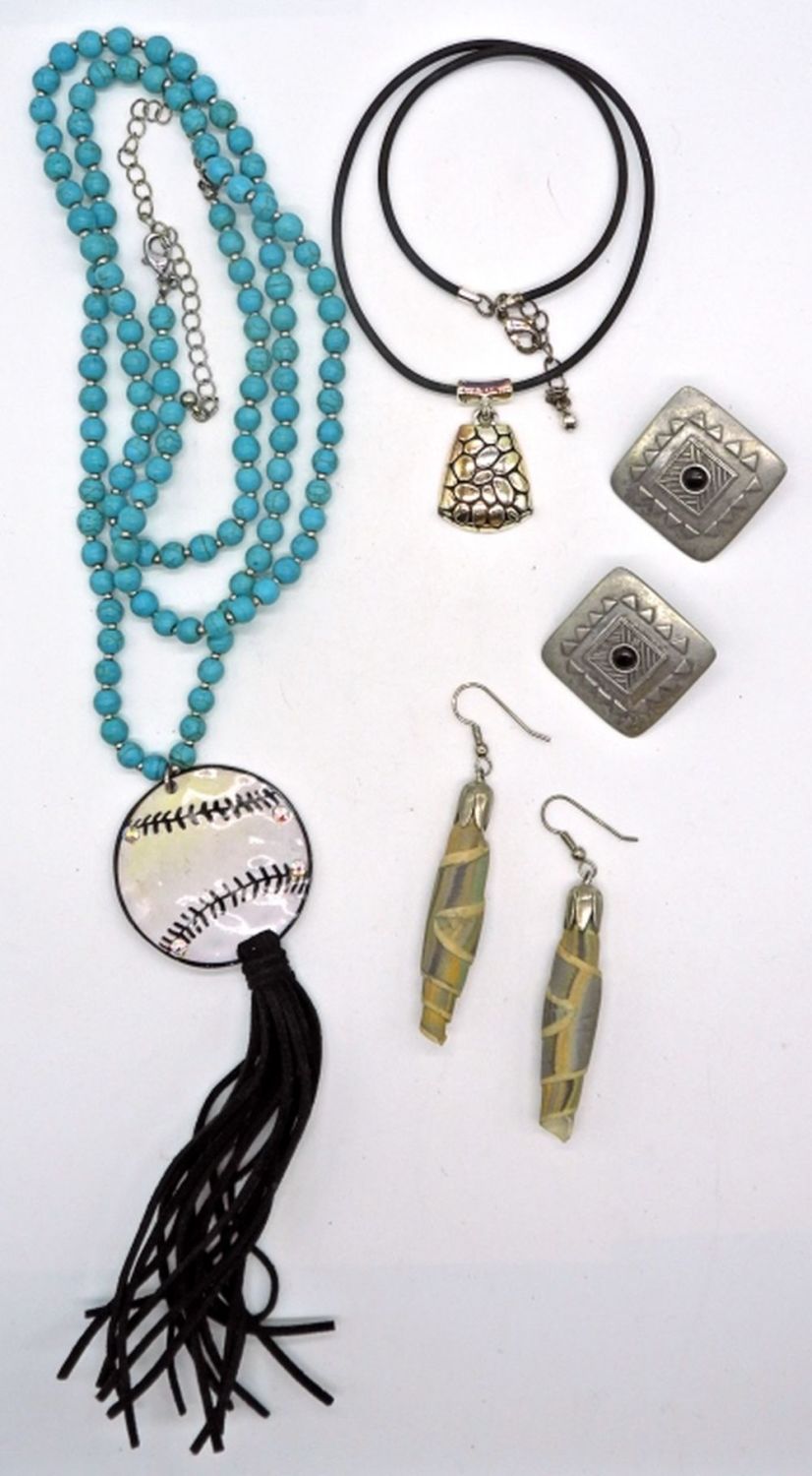 Turquoise colored baseball necklace 36 inches, pendant necklace 16 inches, plus two pairs of earrings