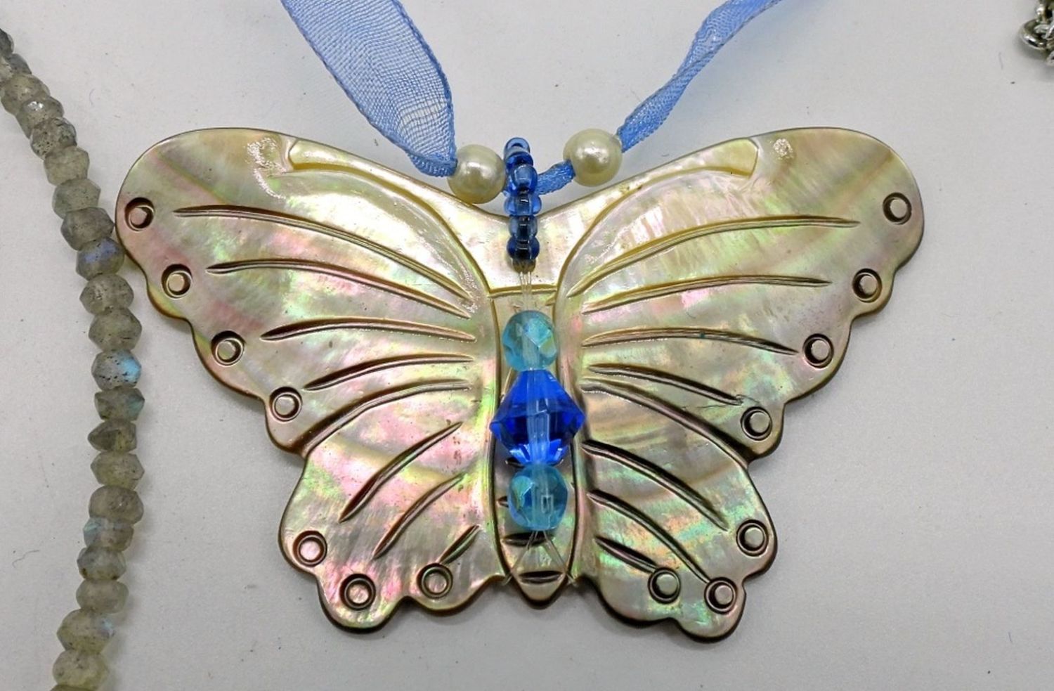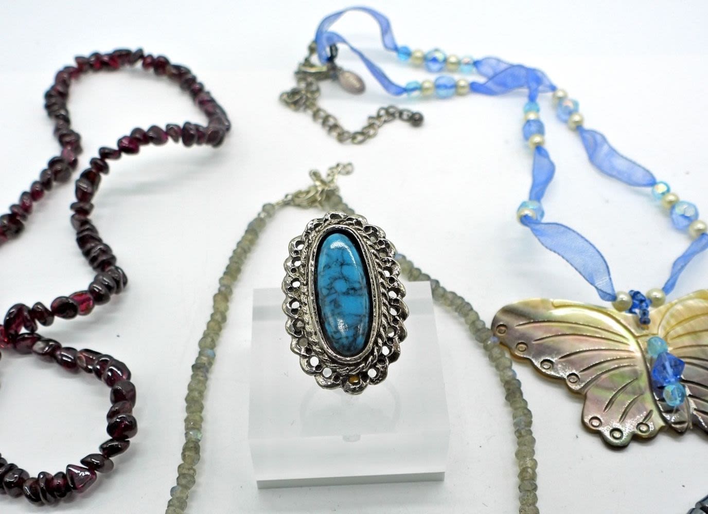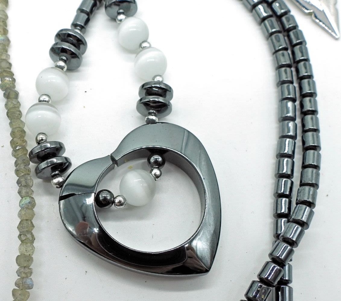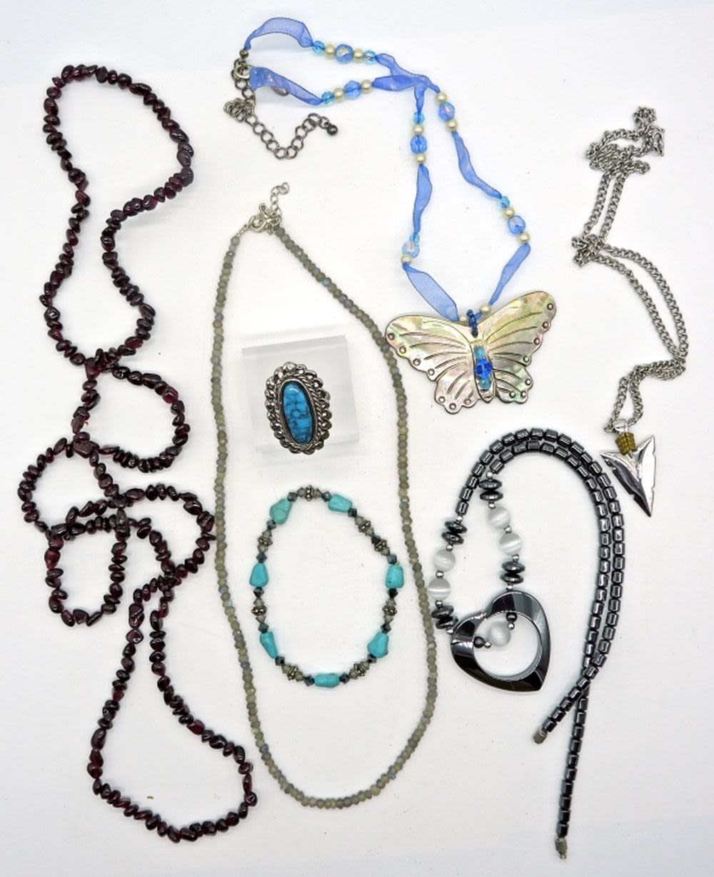 Garnet & labradorite necklaces, hematite heart necklace. Heart is cracked, but could be glued, Mother of Pearl butterfly pendant necklace, and more