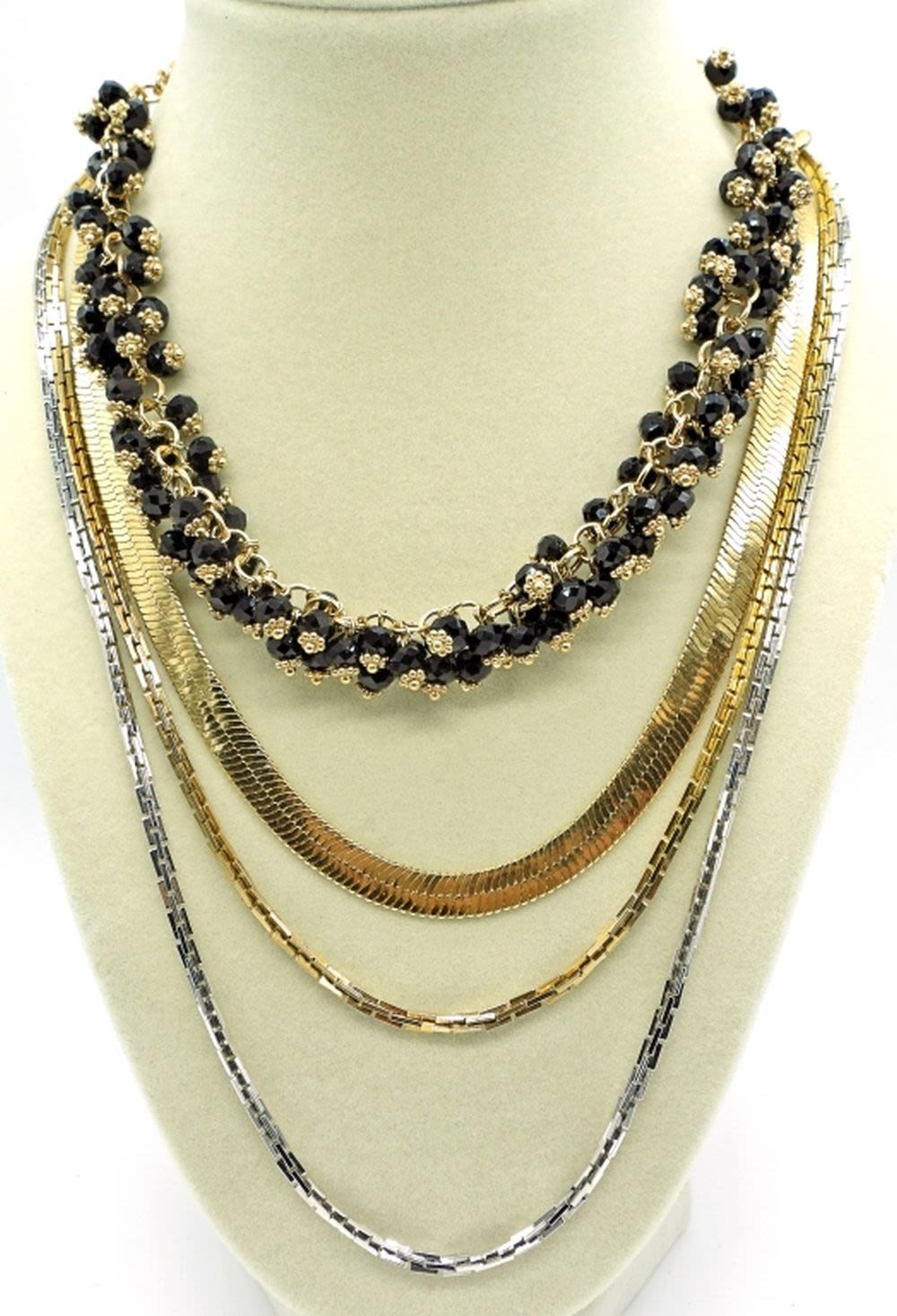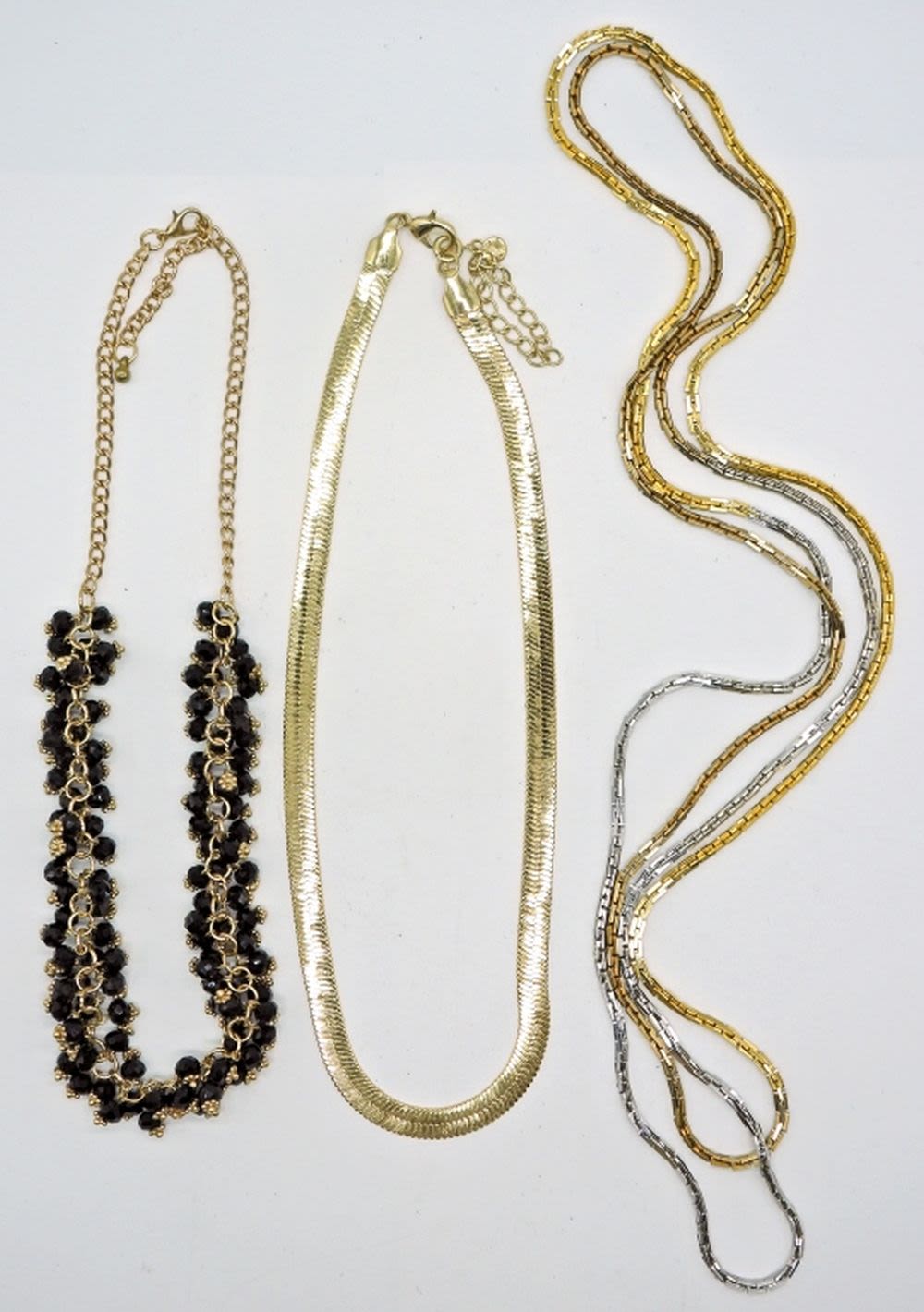 Gold tone black beaded necklace adjustable to 19 inches, gold tone large herringbone chain 16 inches with extender, and long 60 in mixed metals chain for doubling.