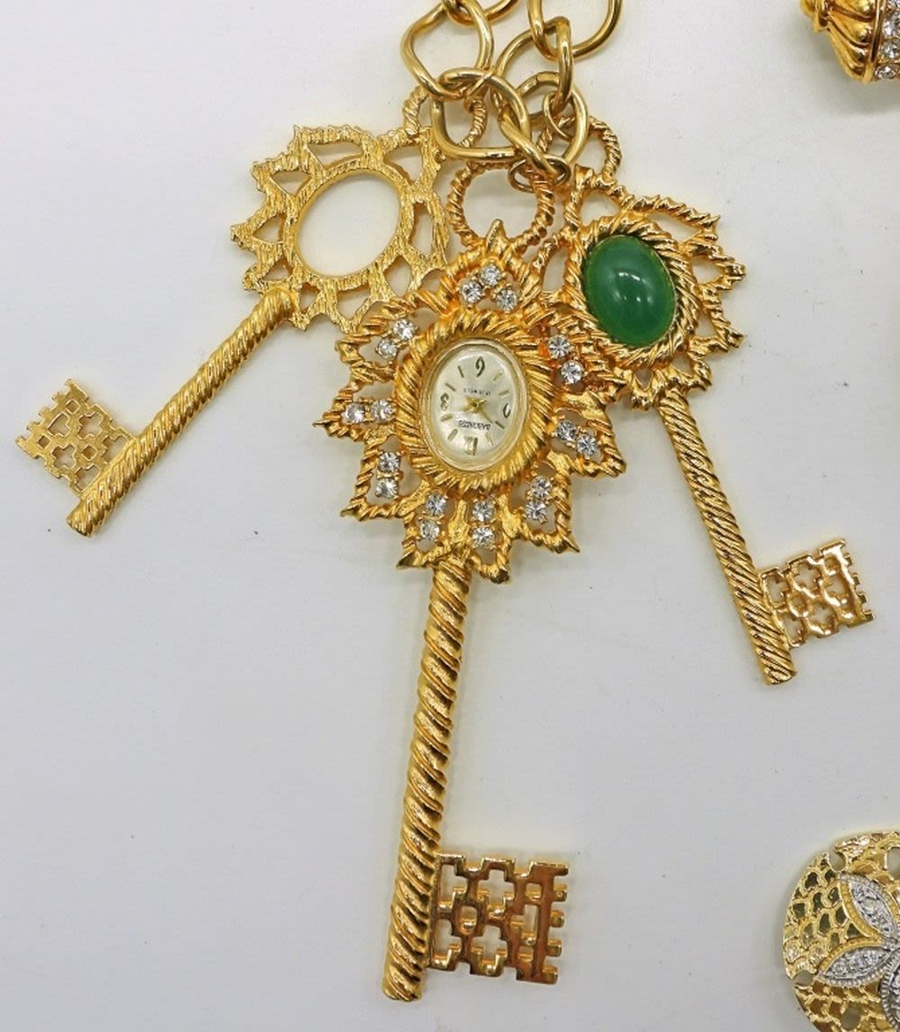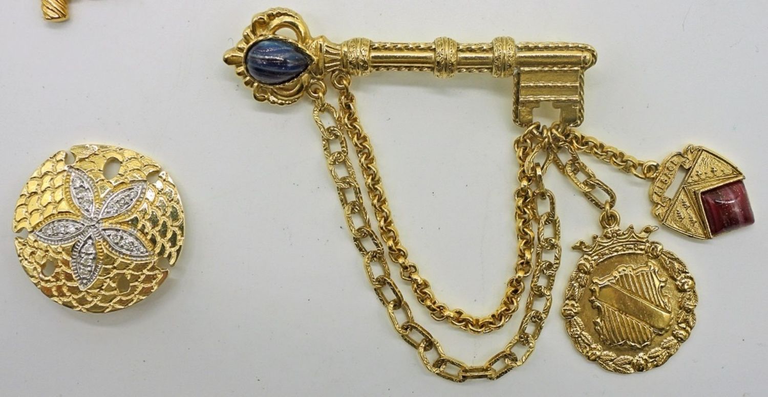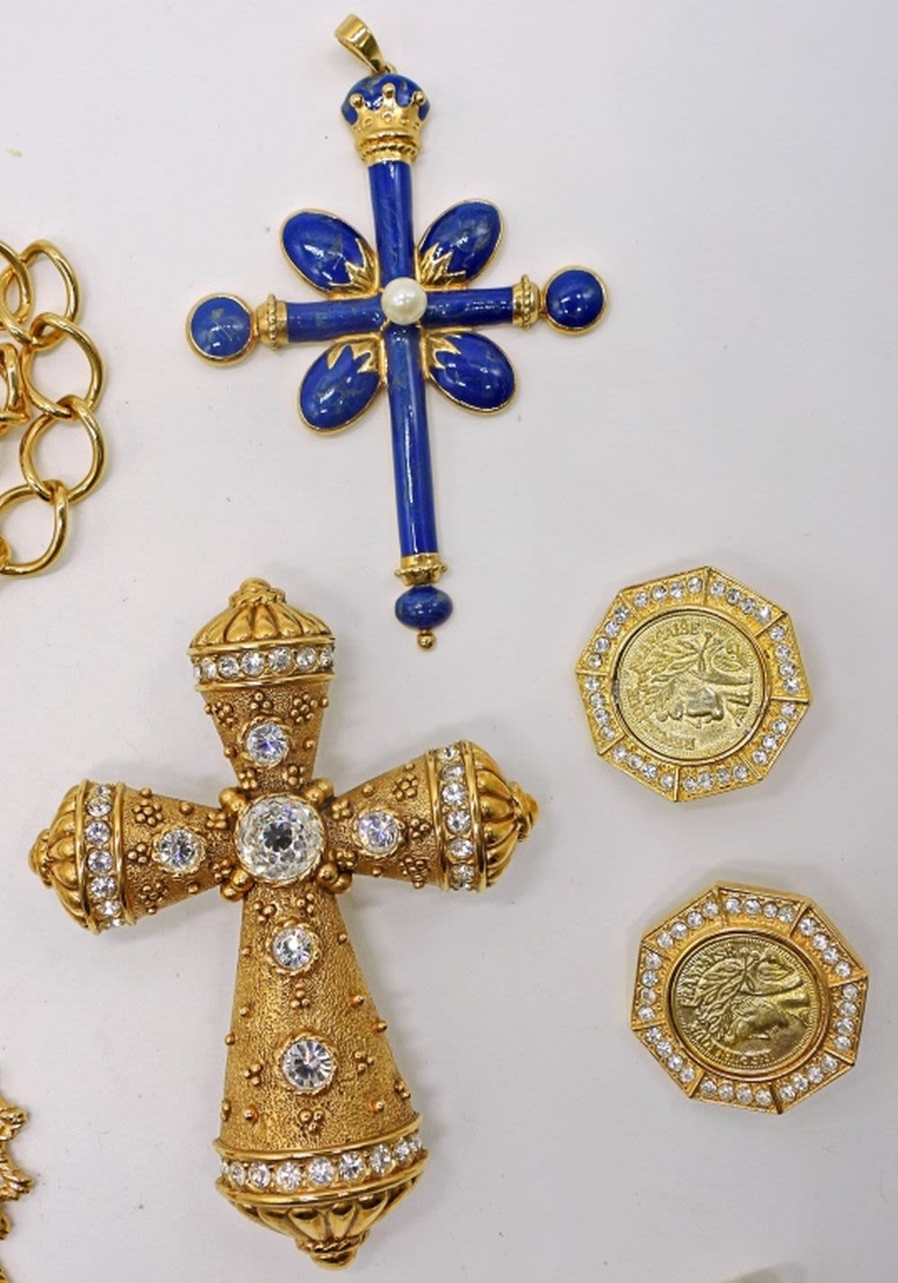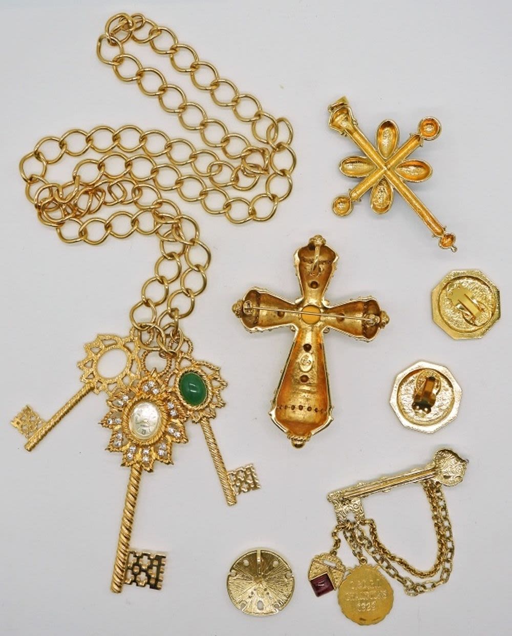 Gold tone lot two cross pendants, key necklace and pin, and more.