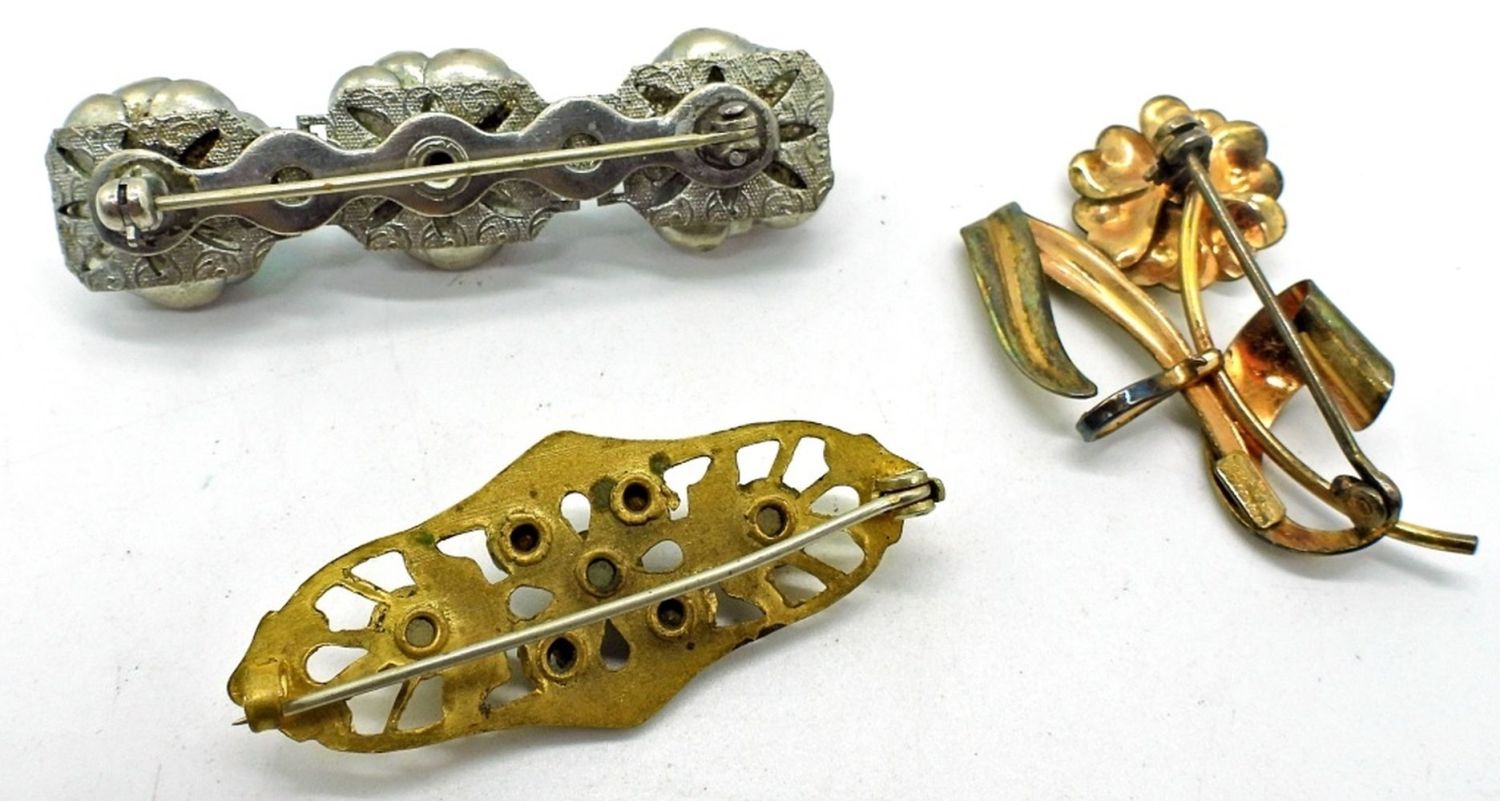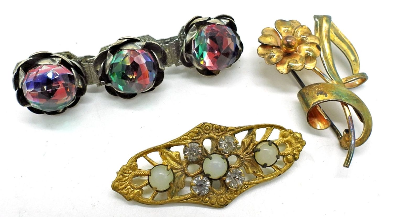 One 12K gold filled on silver, one multi-colored stone, one faux pearl.