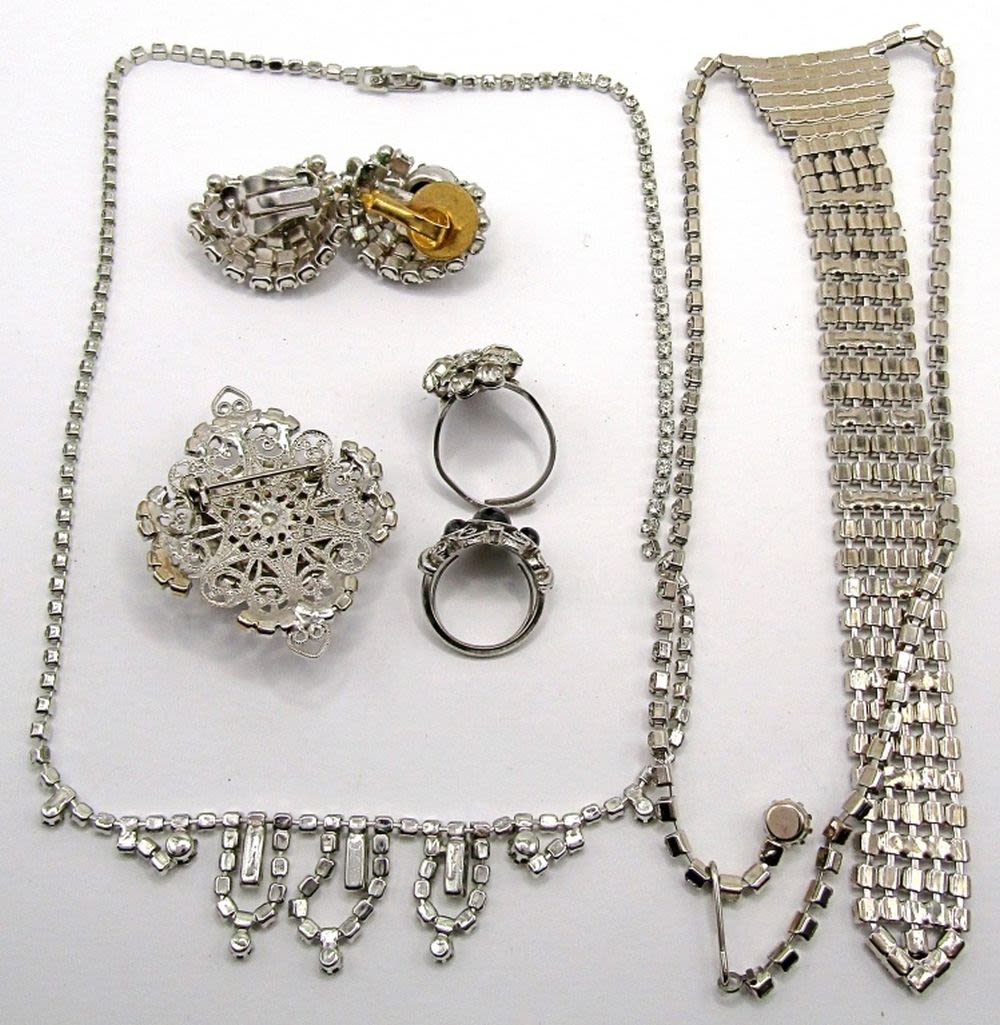 Two necklaces 16 & 17 inches long. One pair clip-on earrings (one has repaired back), brooch pin, plus two rings sizes 4 & 7