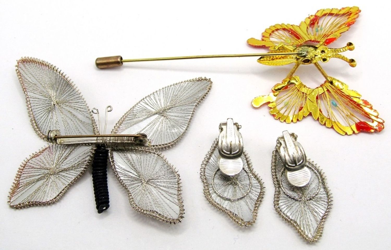 Butterfly motif set. One stick pin and one brooch pin. One pair of earrings.