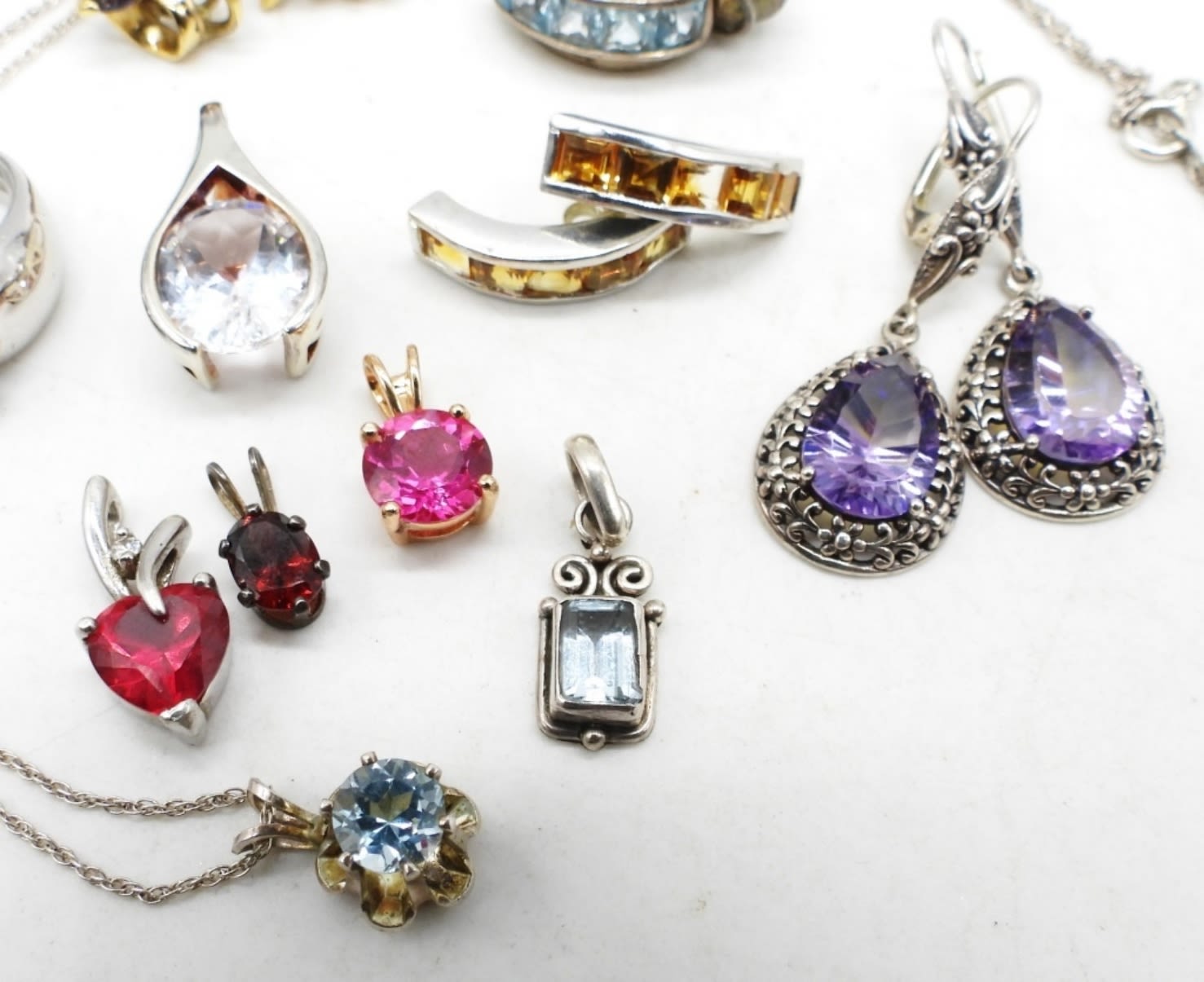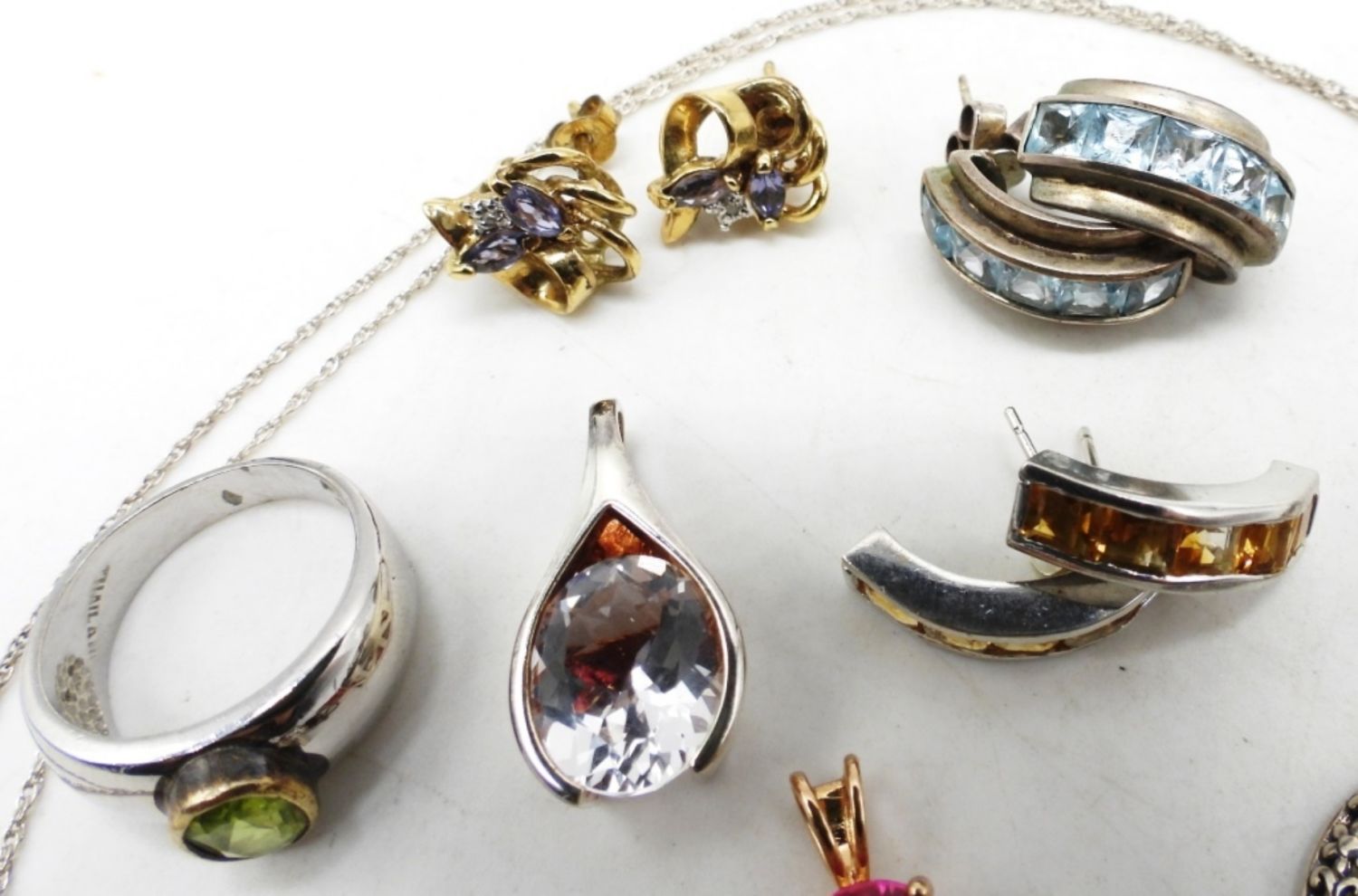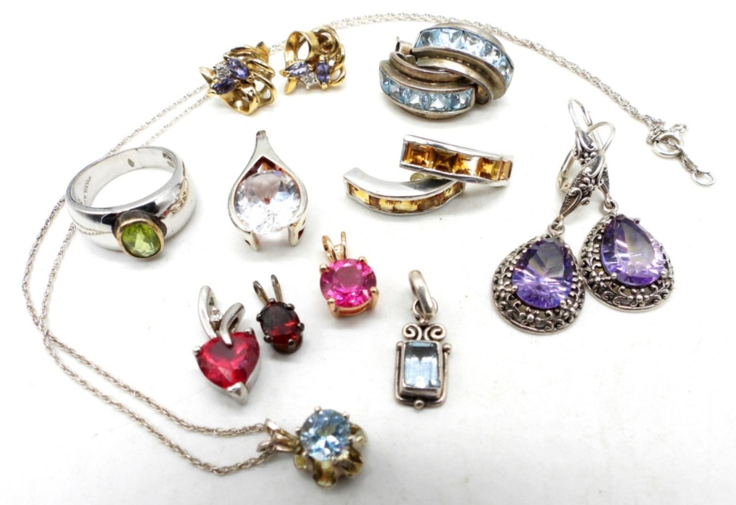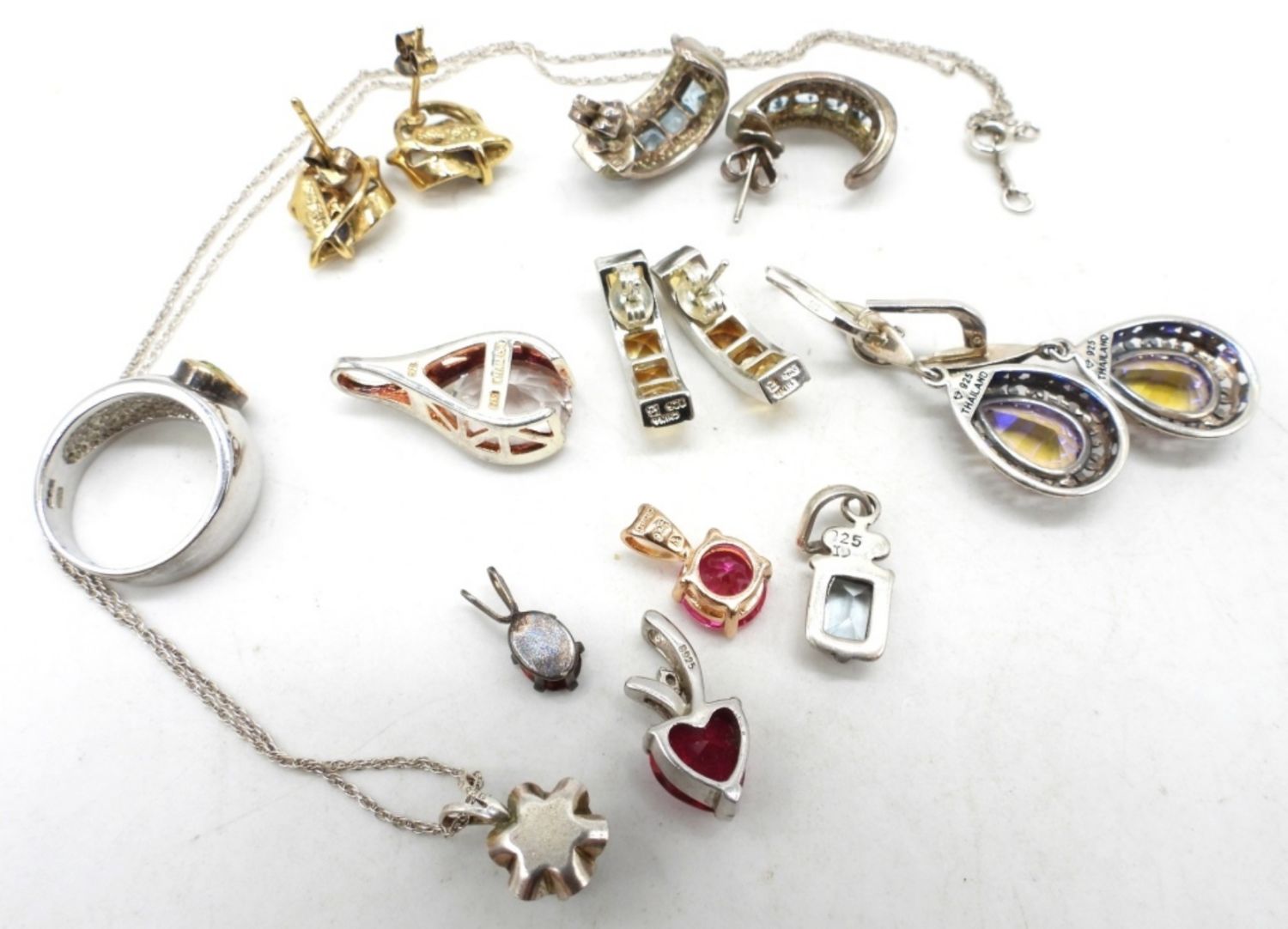 19DWT, 4 PIERCED EARRINGS, 1 RING SIZE 5 1/2″, 1 NECKLACE 18″ LONG, 5 SMALL PENDANT UNDER A 1″ LONG, ALL STAMPED 925