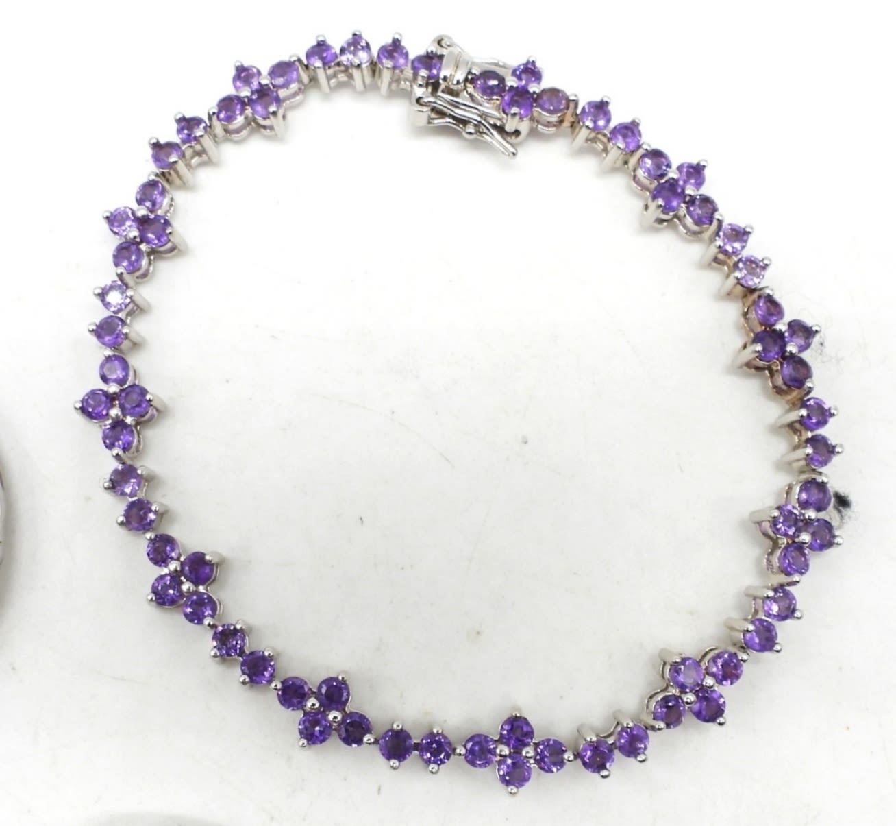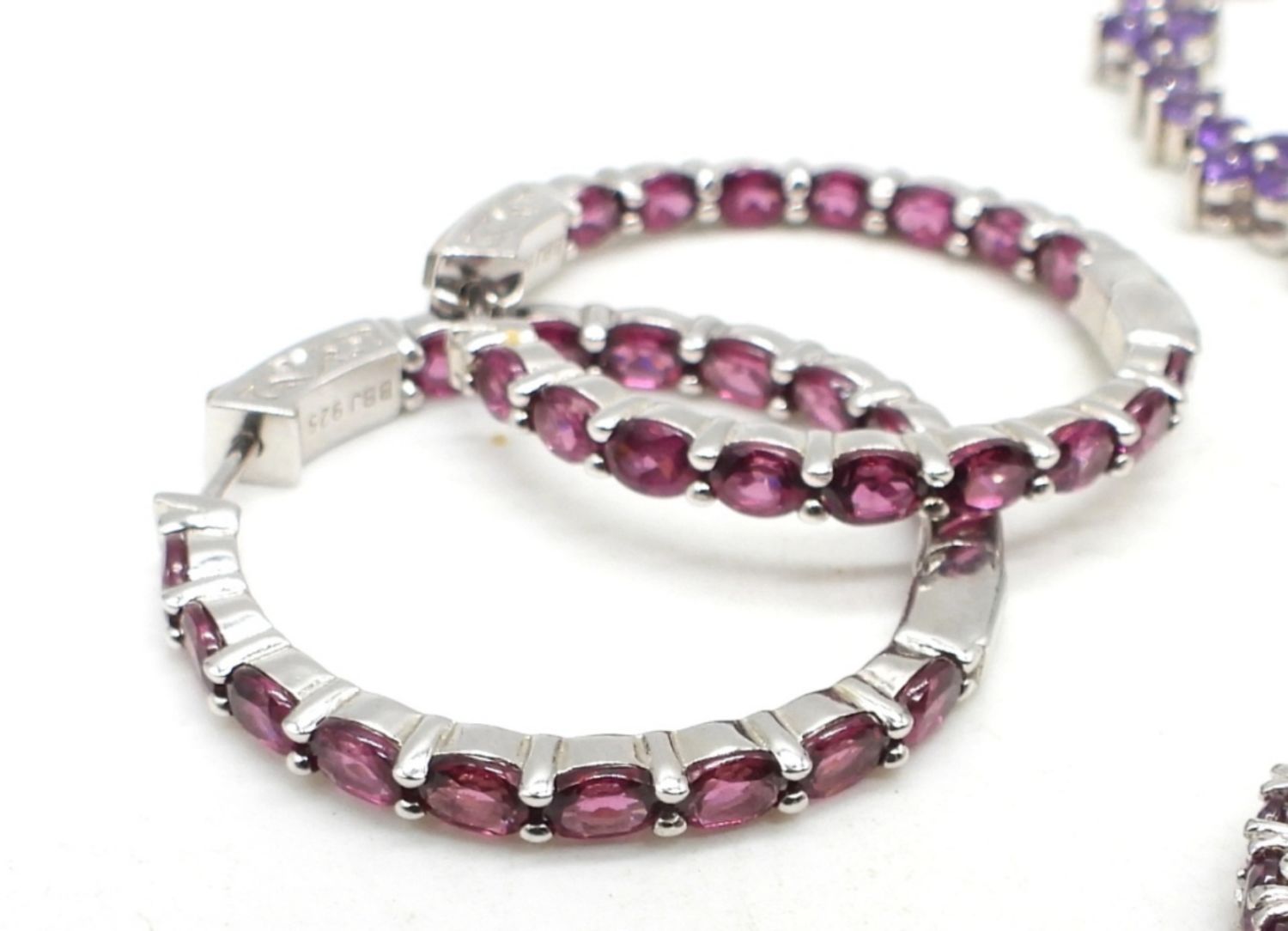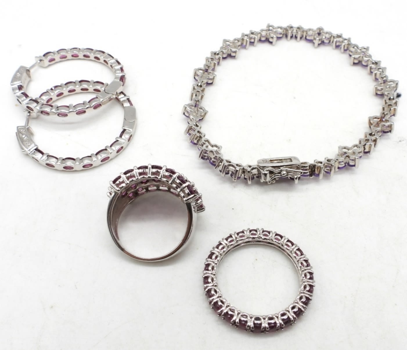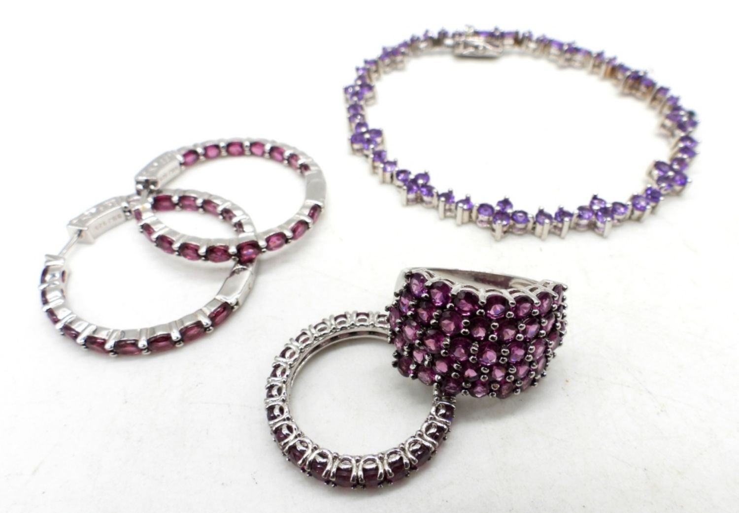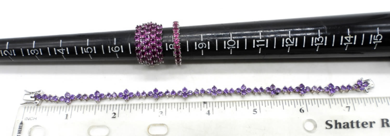19DWT, 7 1/2 PURPLE GEMSTONE TENNIS BRACELET, PINK GEMSTONE RINGS SIZE- 7(1) AND 8(1), EARRINGS PIERCED, ALL STAMPED 925