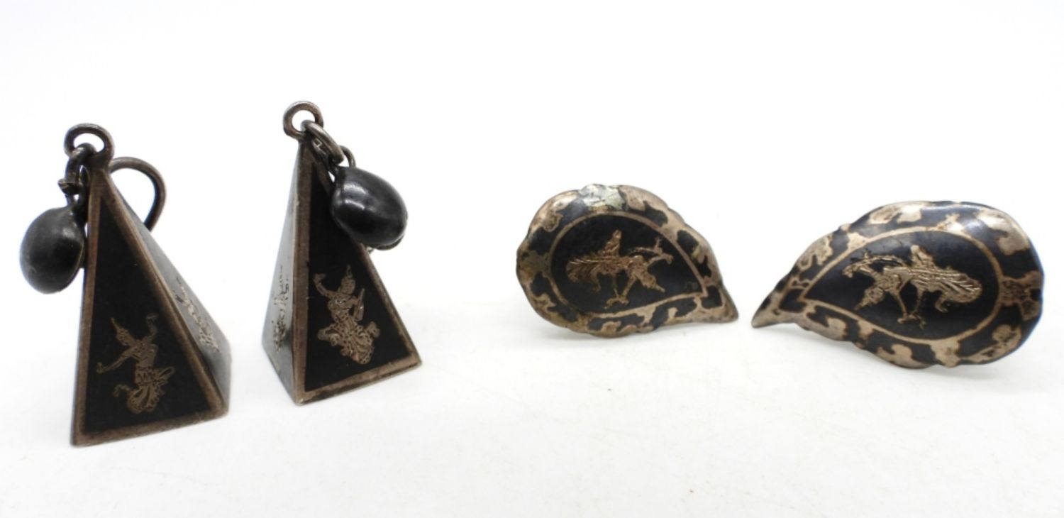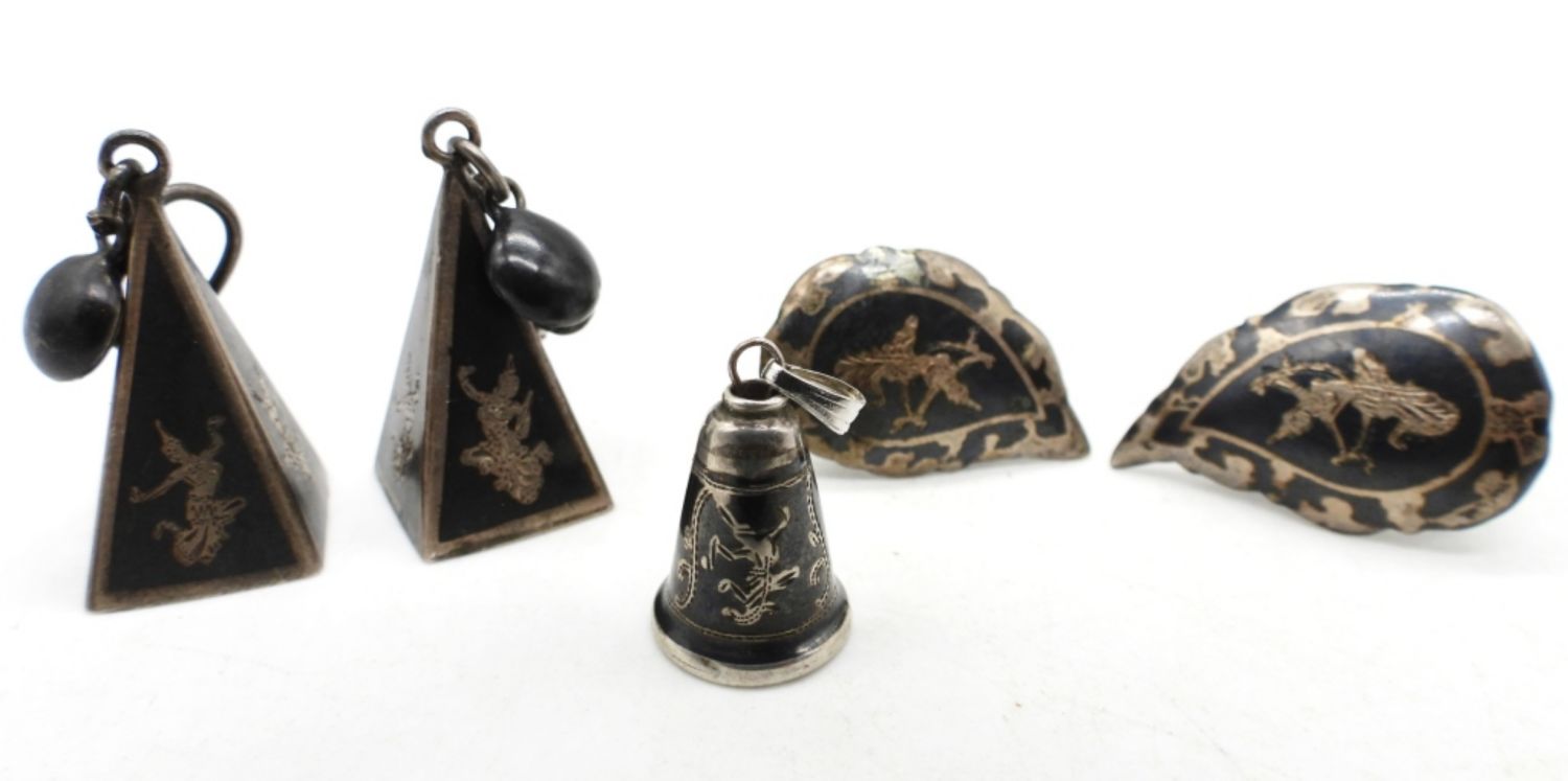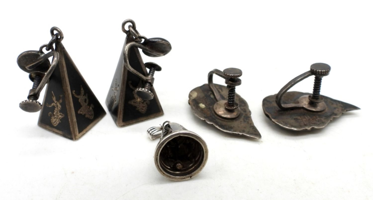 14DWT, 2 SETS OF SCREW BACKS(CLIP-ONS) EARRINGS, 1″ BELL PENDANT, ALL STAMPED STERLING SIAM