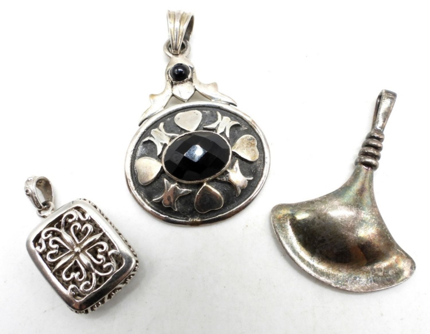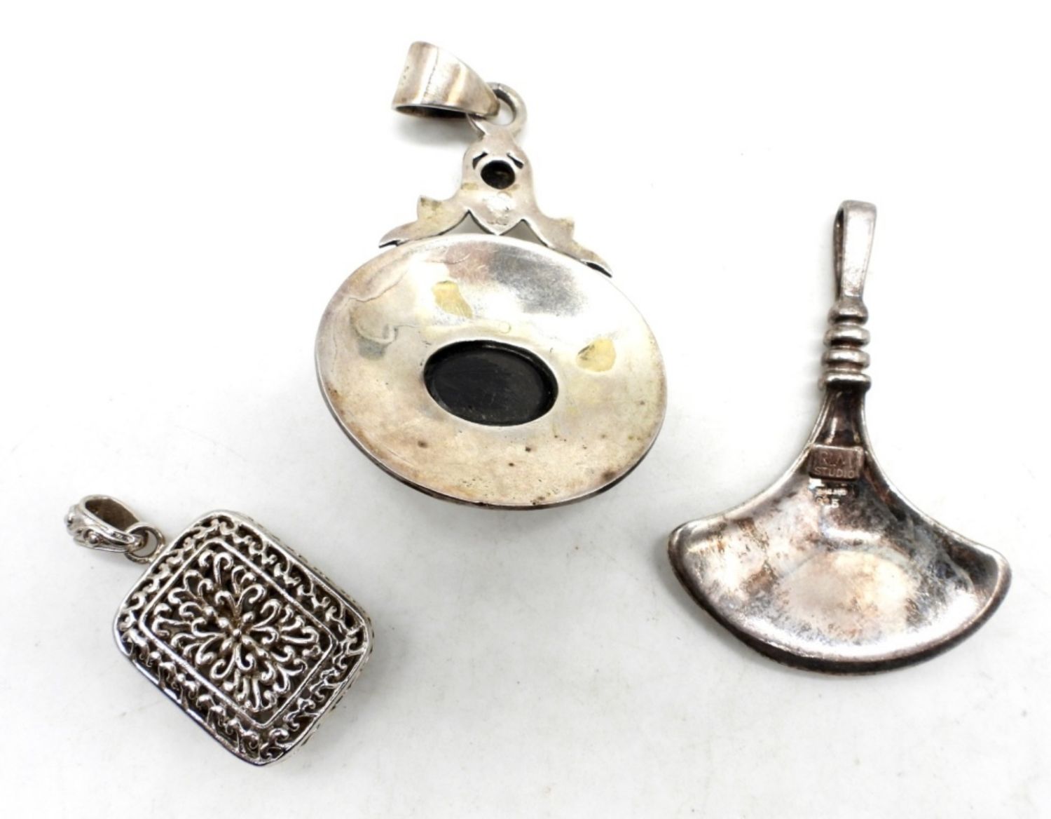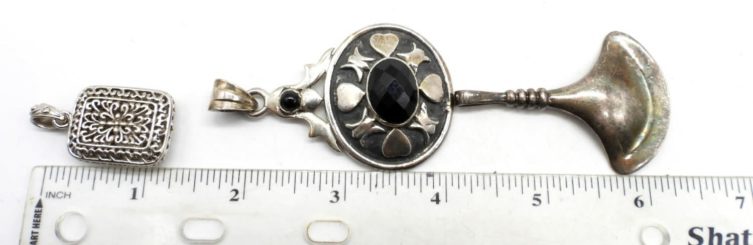 24DWT,1- 2 1/2″ LONG NO STAMPING FOUND, 1- LITTLE OVER 2″ LONG STAMPED RIM STUDIO 925 ON THE BACK, 1- LITTLE OVER A 1″ SQUARE PENDANT STAMPED 925