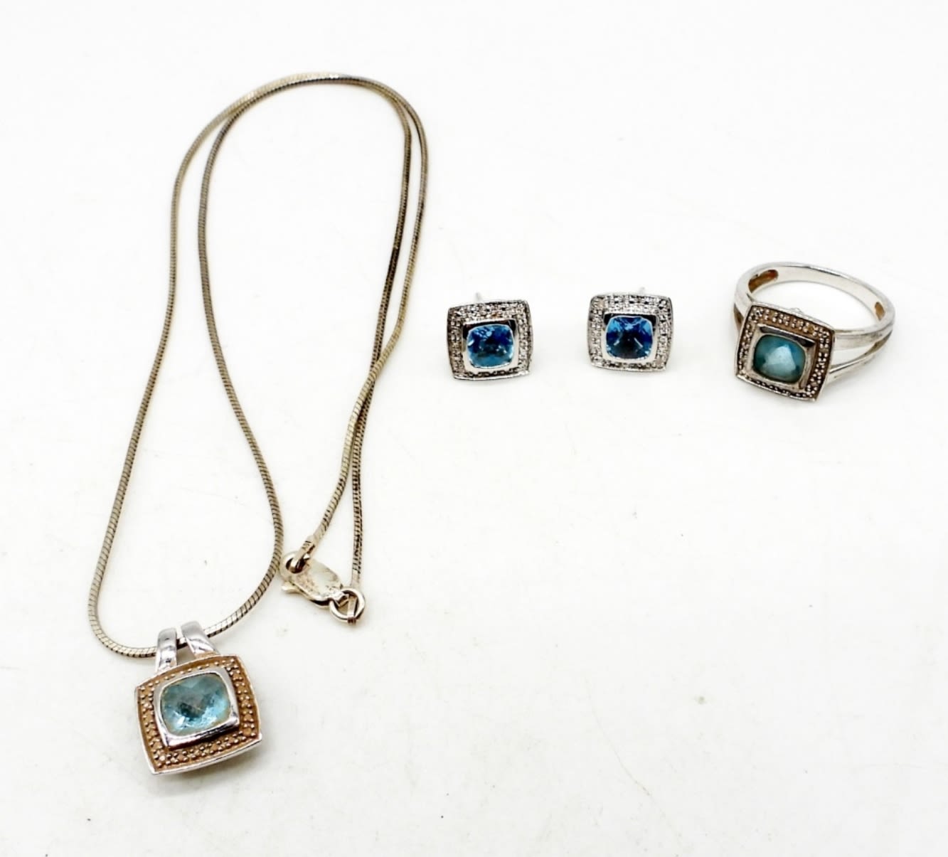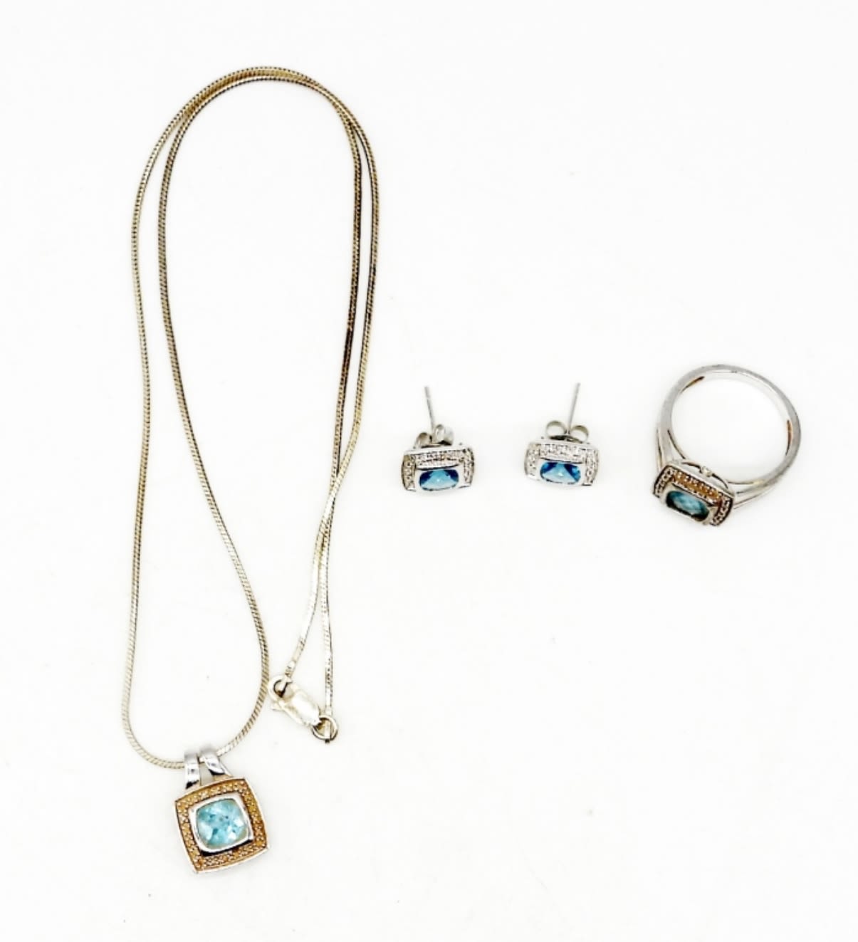 Size 7 ring, one pair stud back earrings, one pendant on 16 inch chain. Needs cleaned, but other wise in good condition. DWT 7