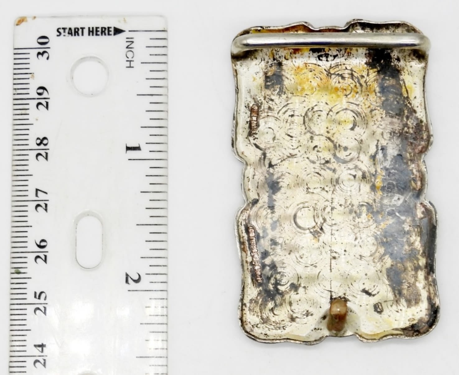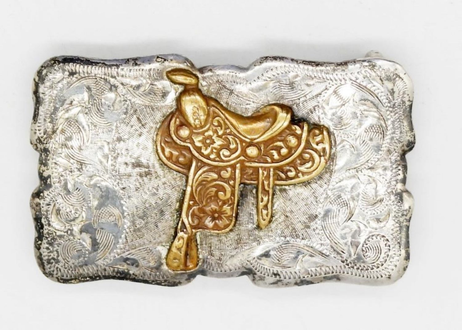 Hand engraved Sterling belt buckle with western saddle detail. 2.35 inches. DWT 19.2