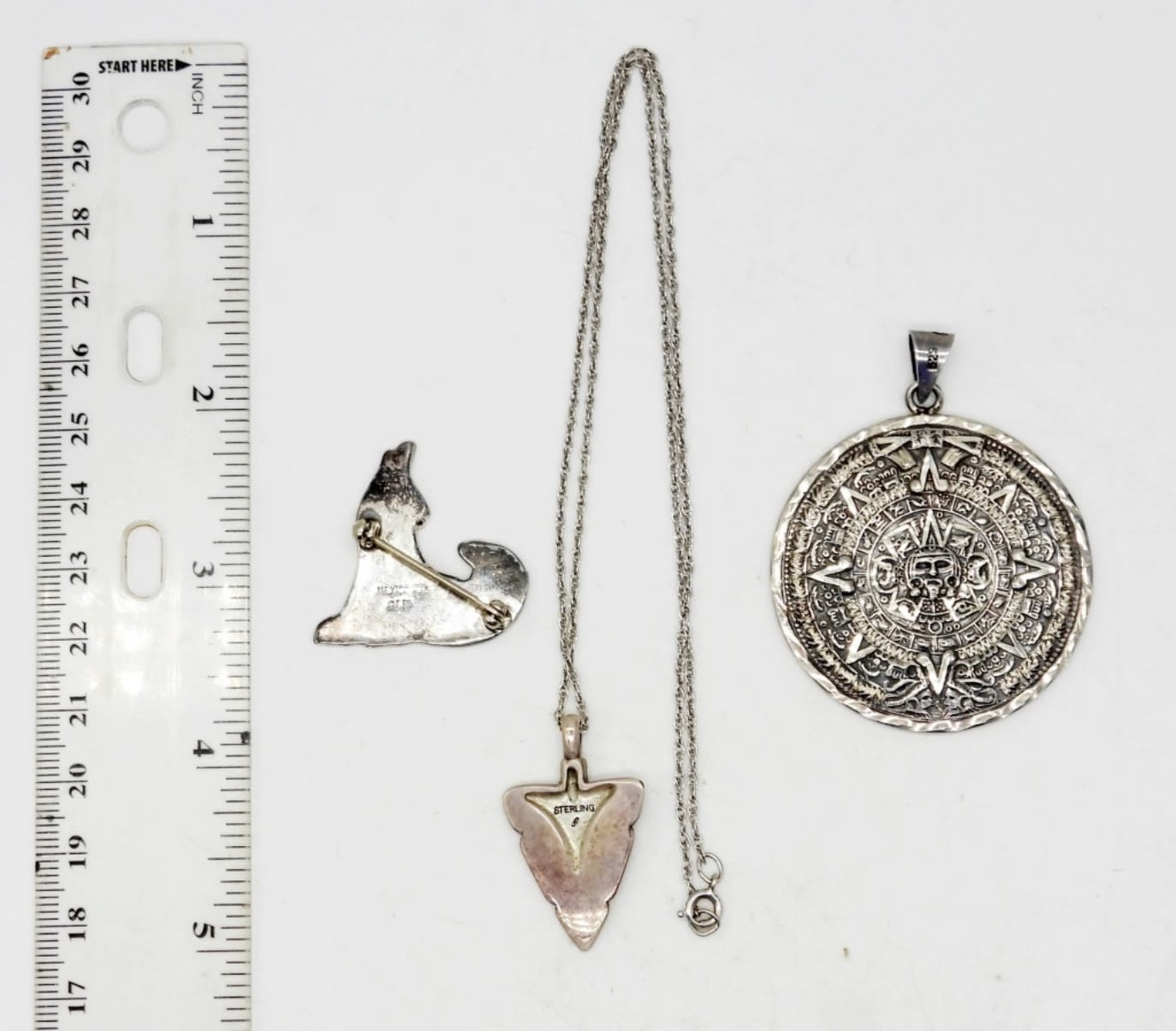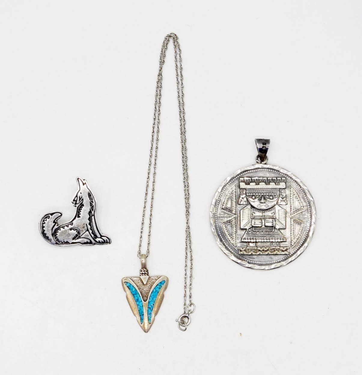 Aztec reversible round pendant 1.65 inches, howling wolf pin 1 inch, and turquoise arrowhead pendant on 18 inch chain. DWT 20.1