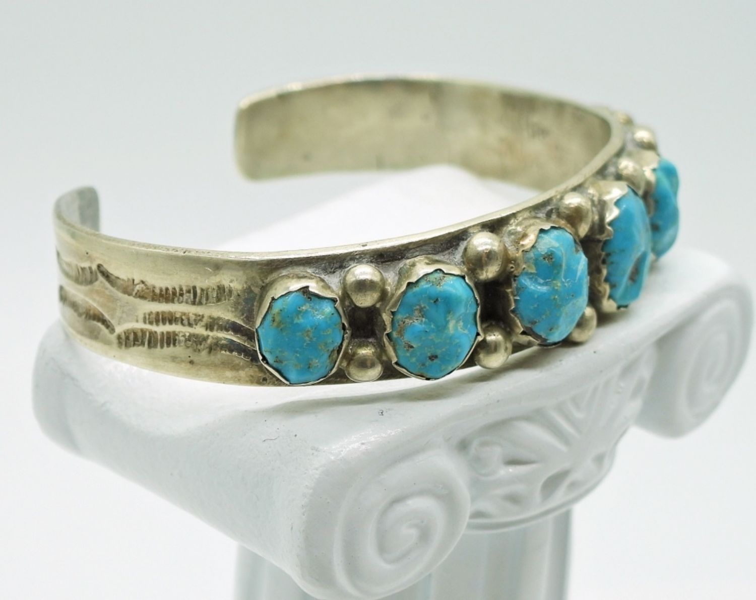 Four vintage Sterling cuff bracelets with turquoise stones, and red jasper stones. DWT 63.4