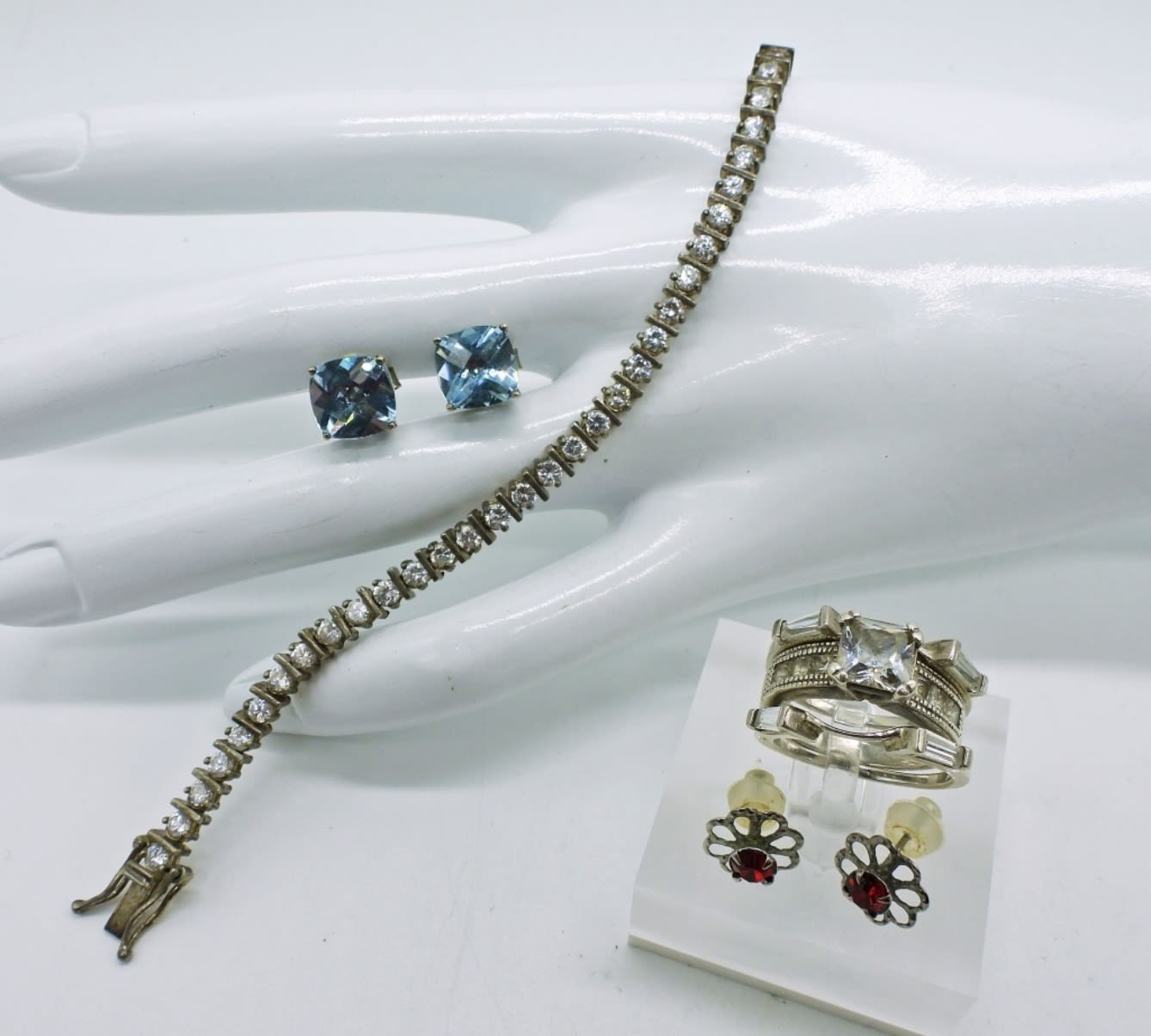 Ring size 6.5, white rhinestone tennis bracelet, and two pairs of stud back earrings. DWT 15.5