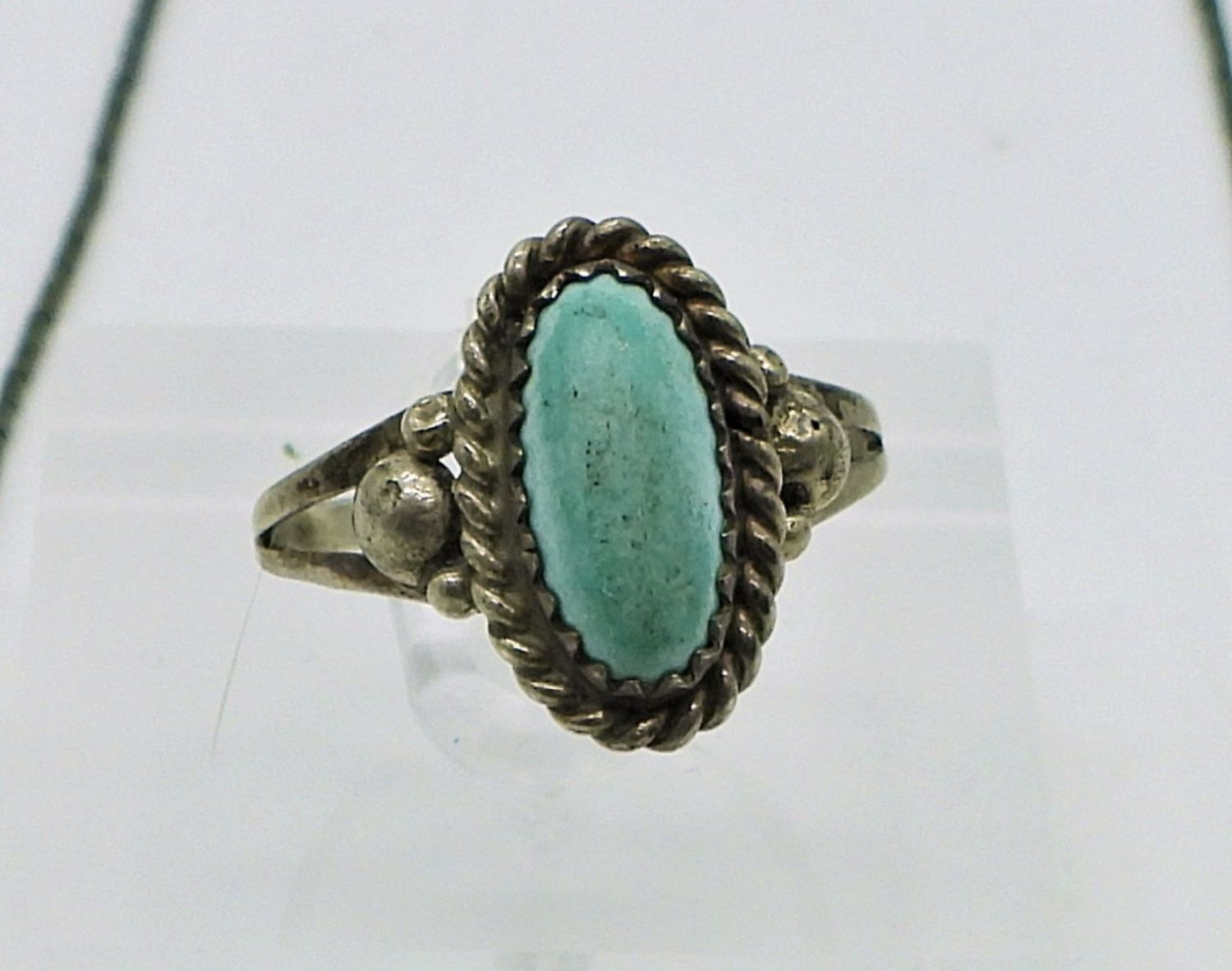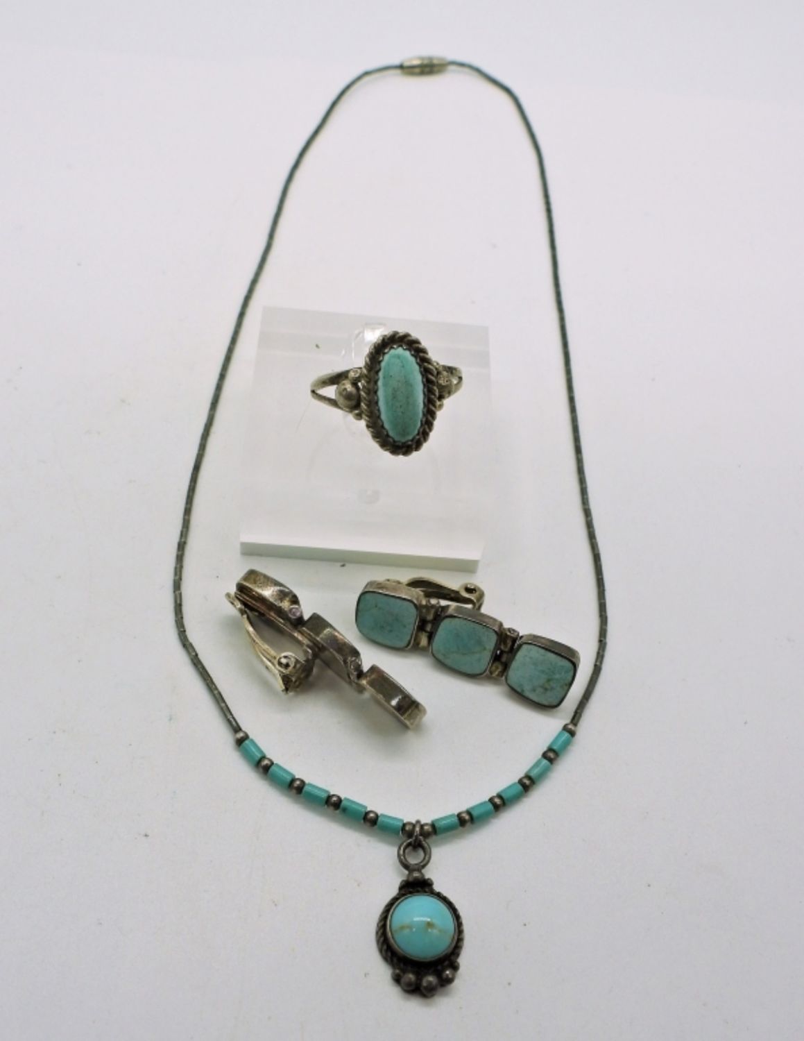 16 inch liquid Sterling necklace with turquoise pendant, ring size 7.5, and one pair clip-on earrings. DWT 9.2