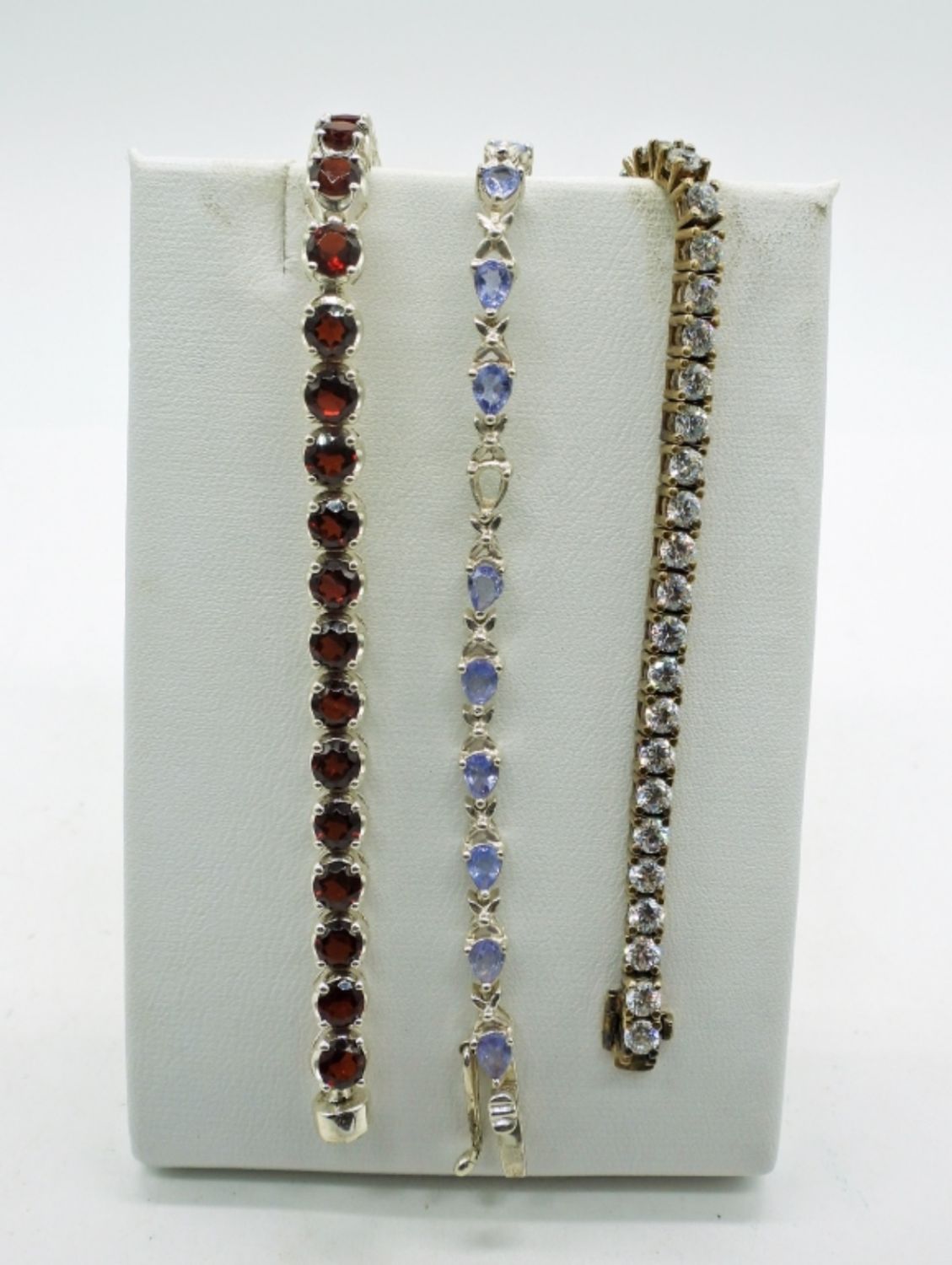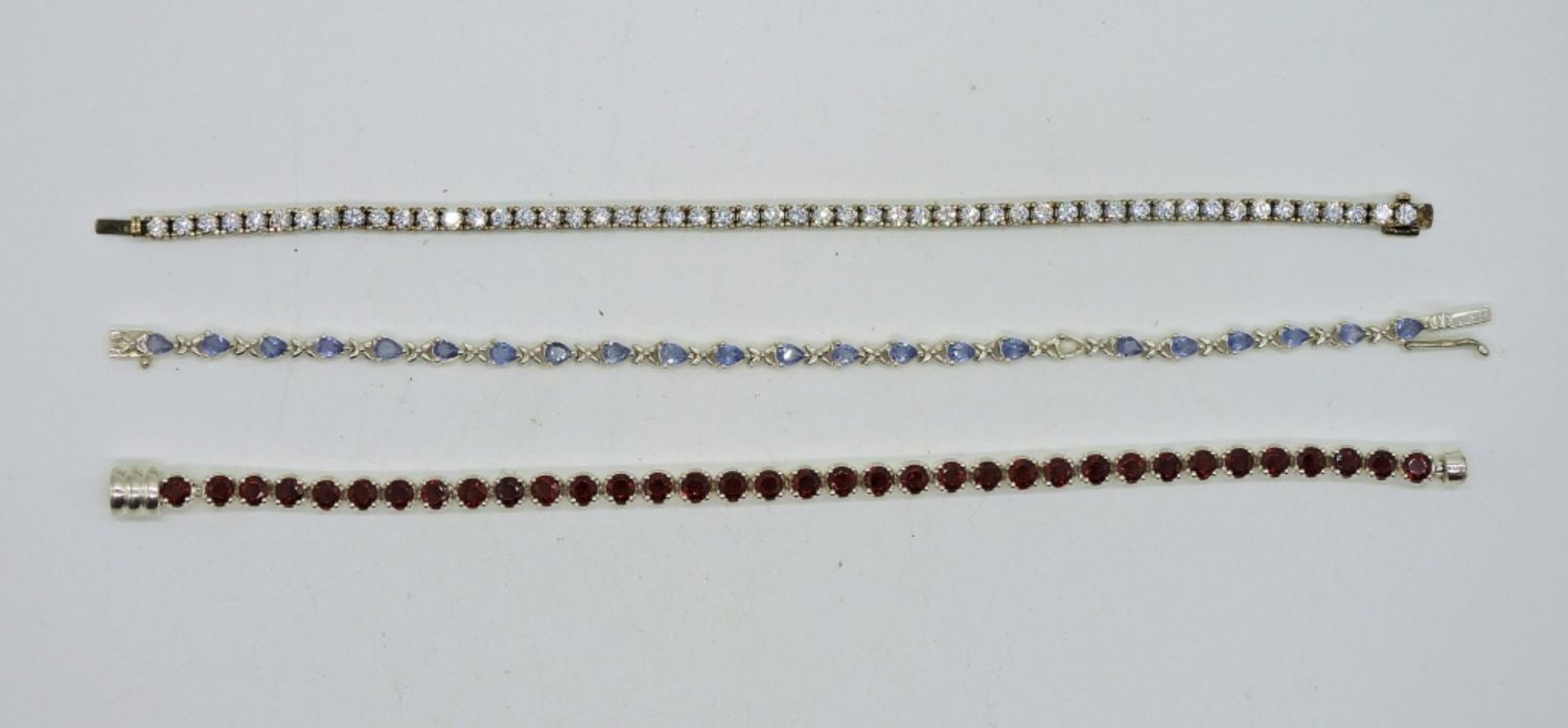 Three 7 inch bracelets. Two silver tone, and one gold tone. Multiple stone colors. DWT 18.1