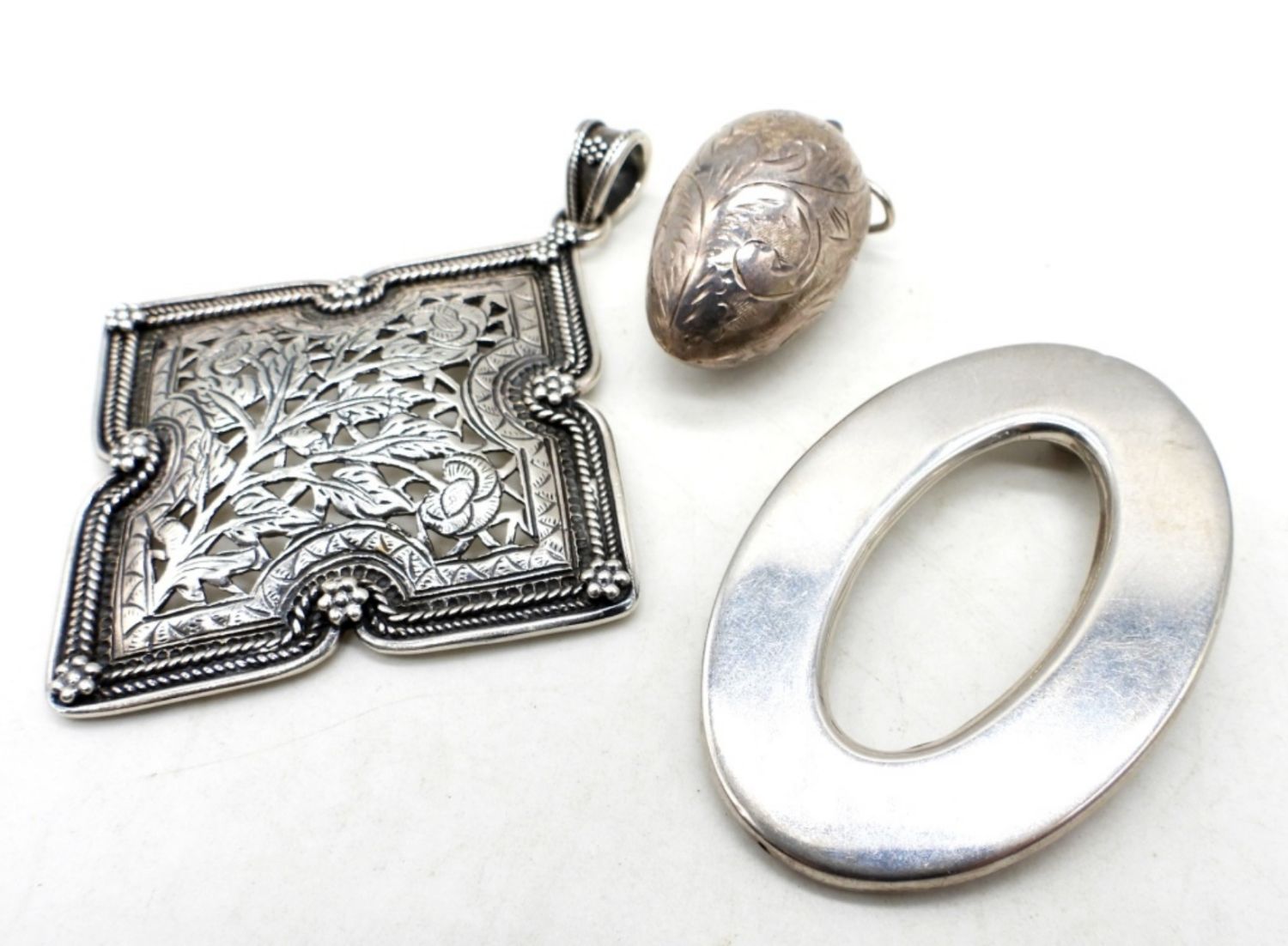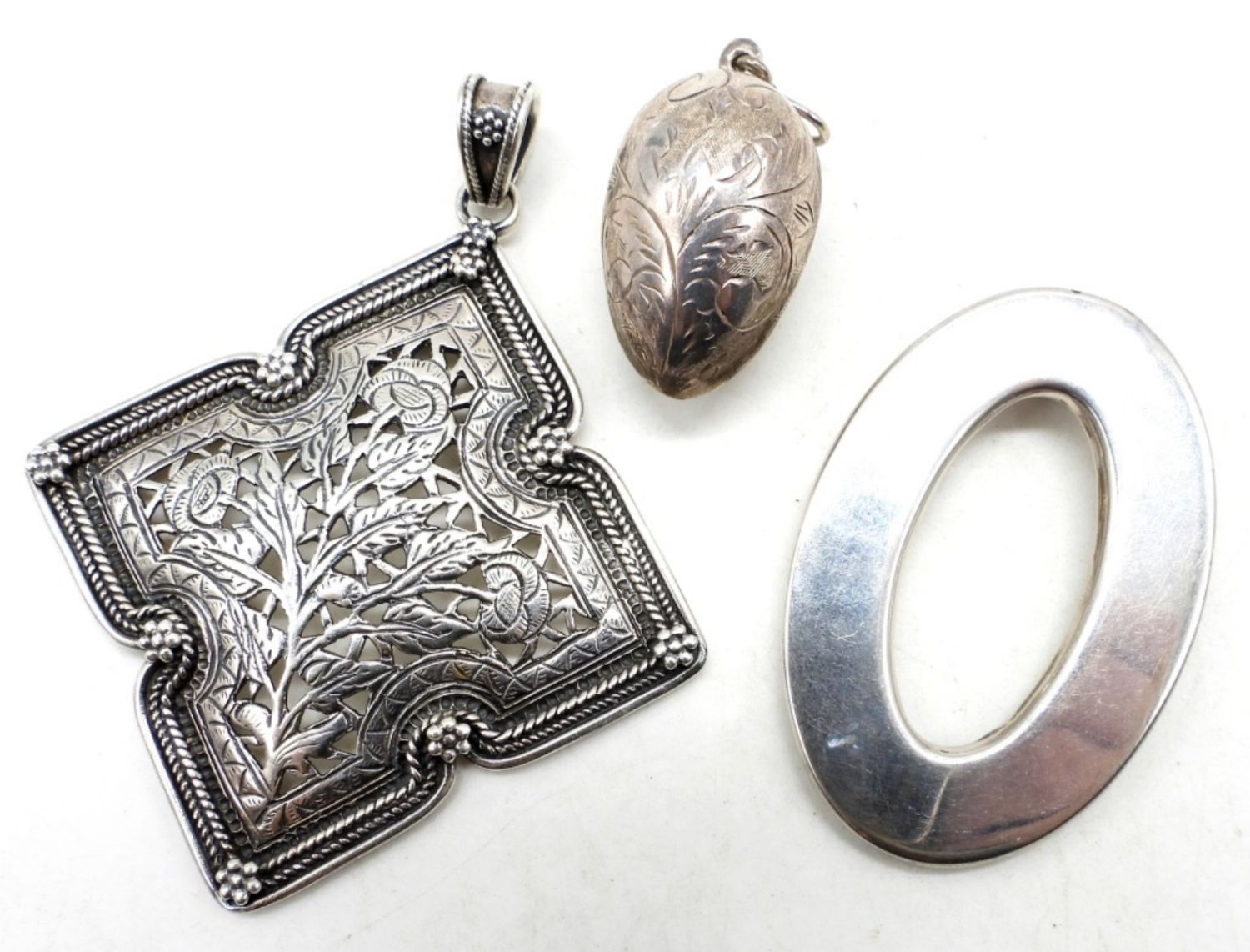 29DWT, ALL STAMPED 925,ETCHED EGG 1 1/2″ LONG, 1 OVAL 2″ LONG, 1 FLOWER PENDANT 3″ LONG