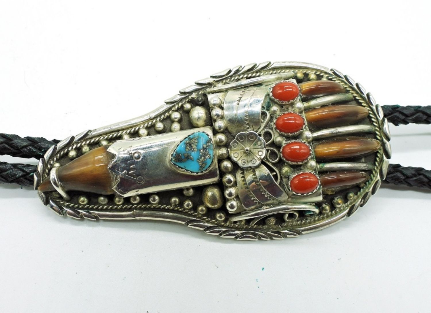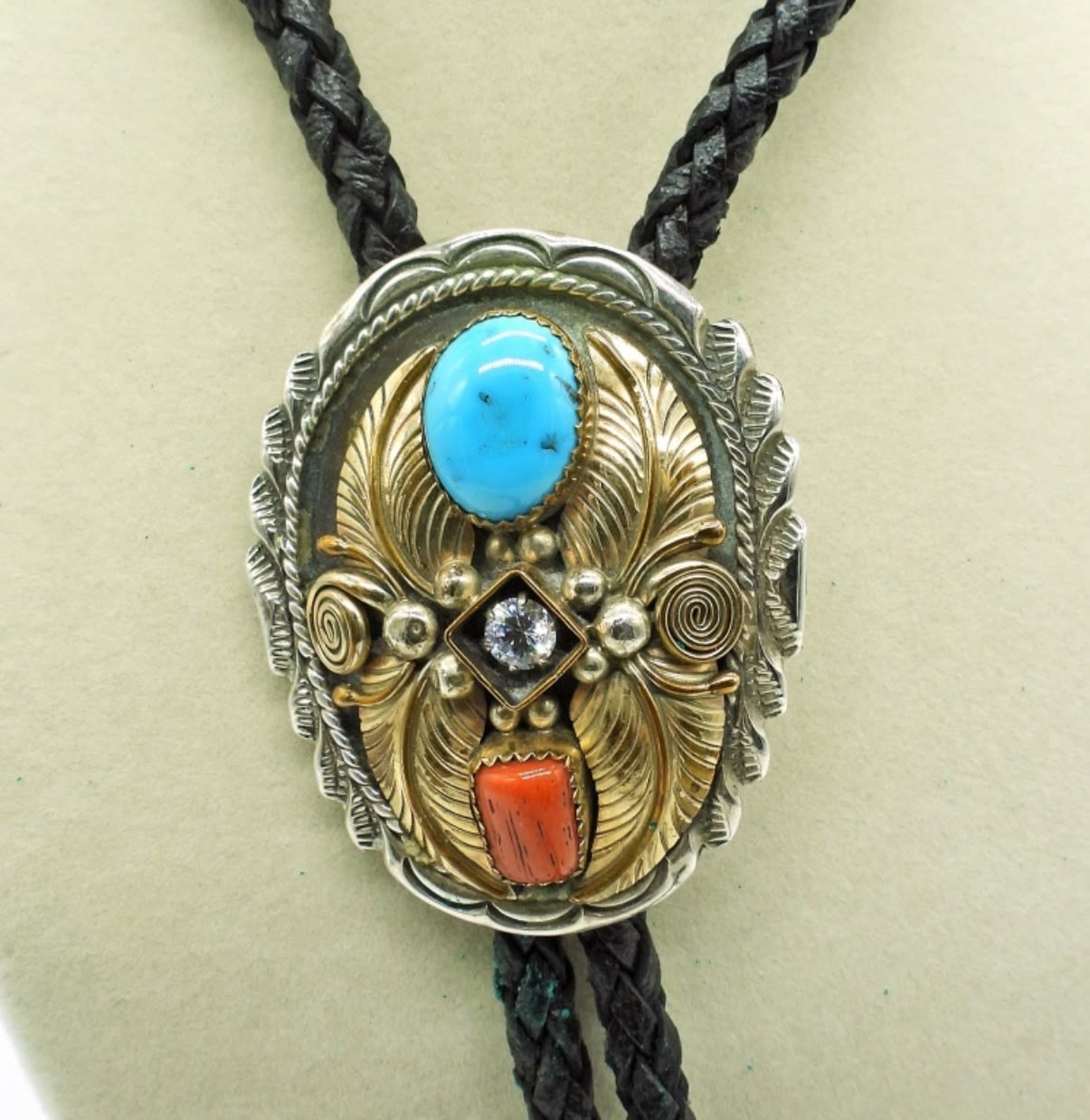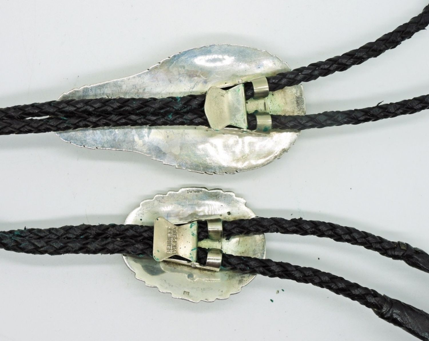 Two Leather 925 Vintage Navajo Bolo Ties with Turquoise and other Gemstones. DWT 73.5