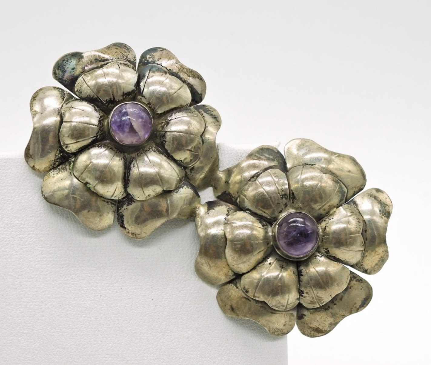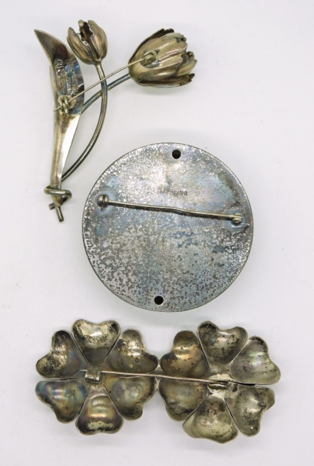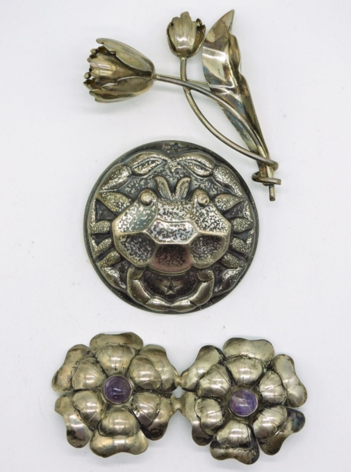 Crab Brooch, Double Flower Amethyst Brooch & Tulip Brooch in Sterling DWT 45.5