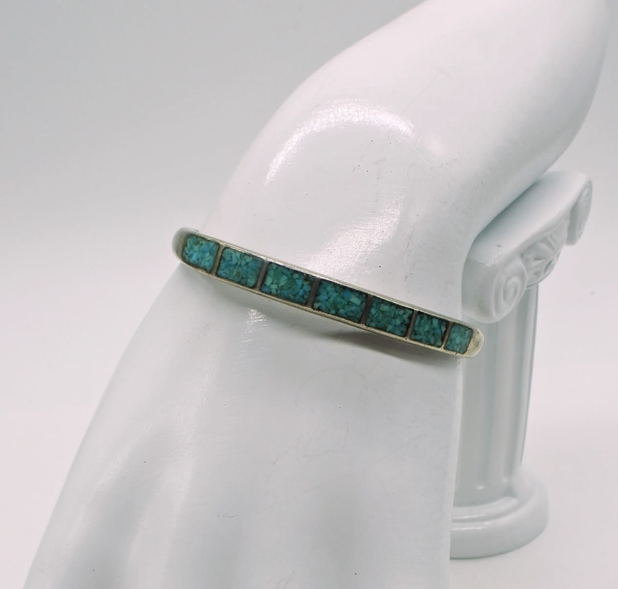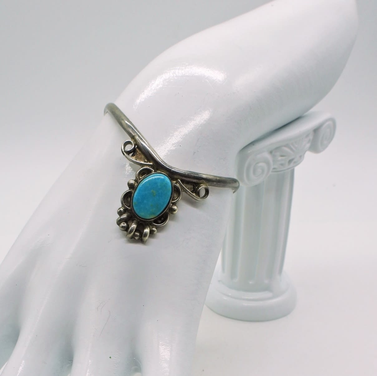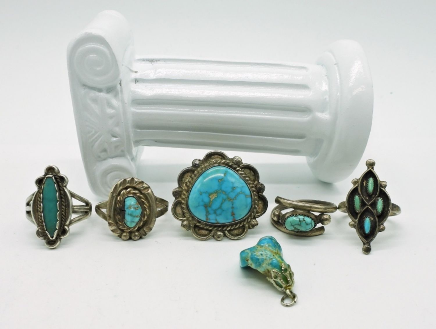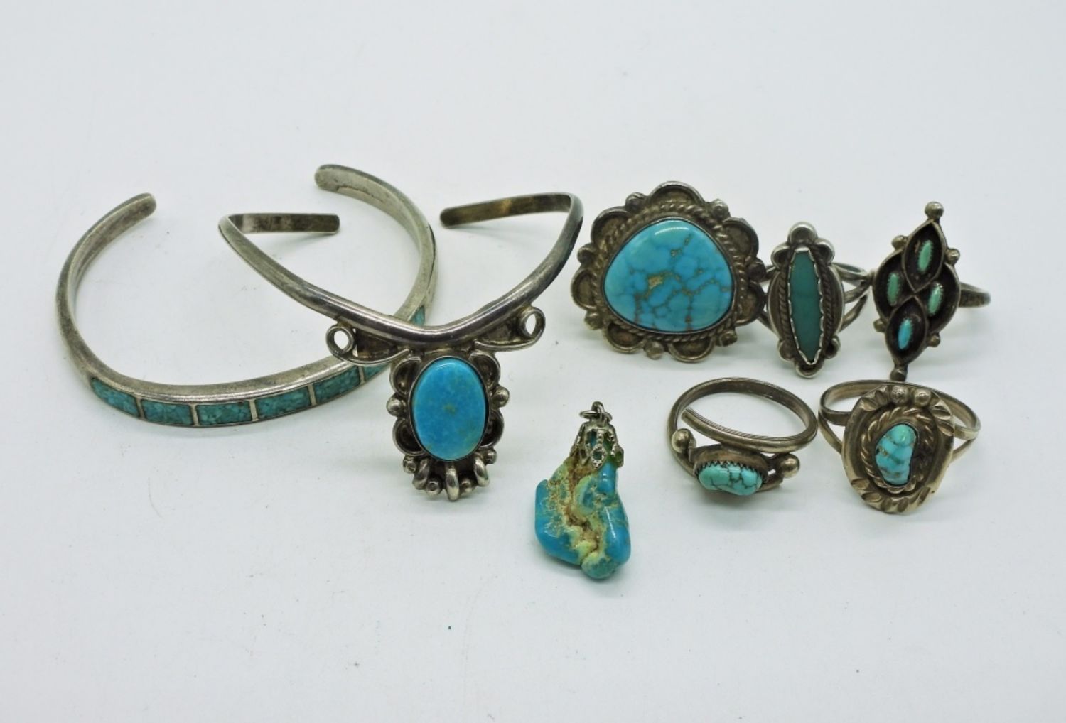Two Sterling Turquoise Cuff Style Bracelets, Turquoise Pendant & 5 Turquoise Rings Sizes 4.5 to 8 DWT 36.5