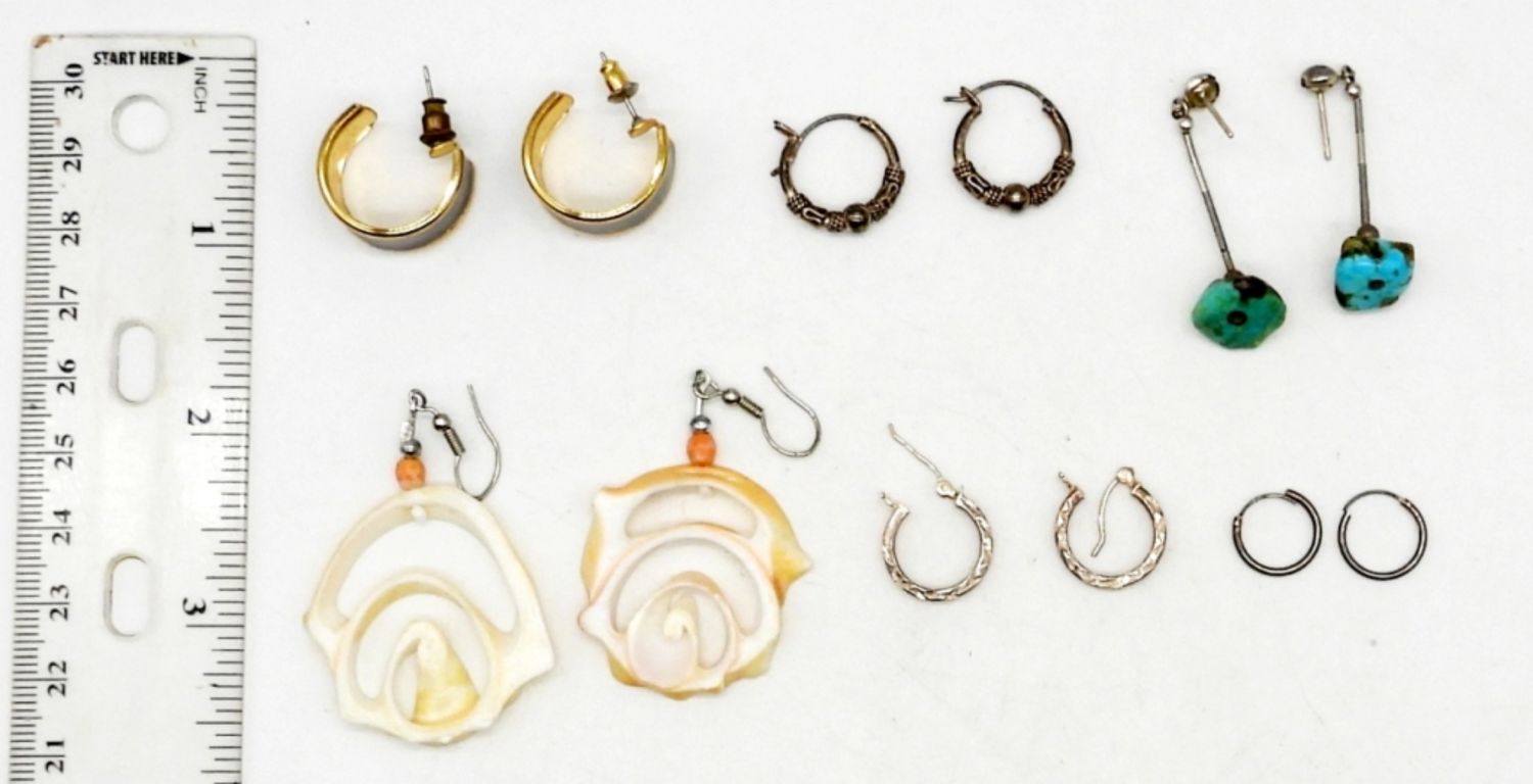 STERLING SILVER EARRINGS WITH TURQUOISE, SHELLS, SILVER & GOLD TONE; 11.2 DWT