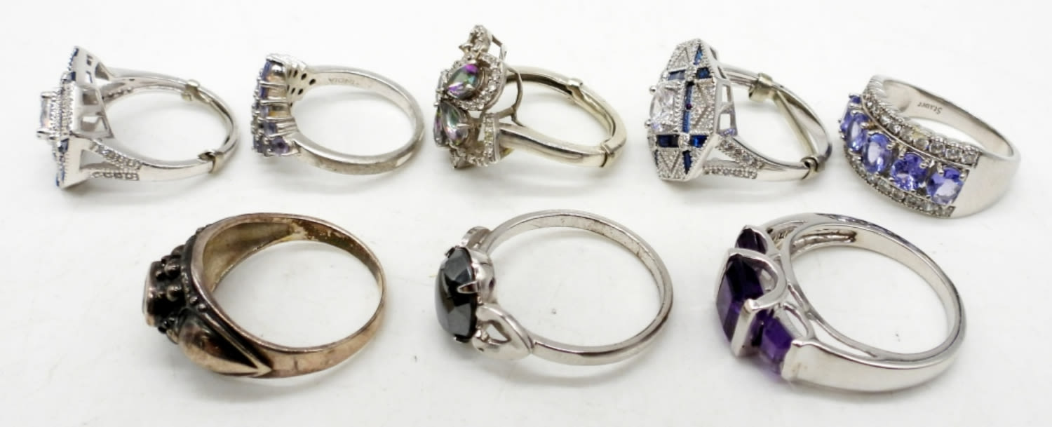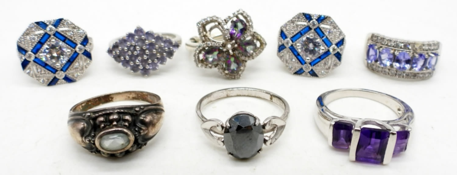 VINTAGE STERLING WITH HEMATITE & PURPLE, BLUE & CLEAR RHINESTONES, STAMPED THAILAND 925, STERLING, INDIA, 925, STAUER 925, SIZES VARY 5-9, 21.5 DWT