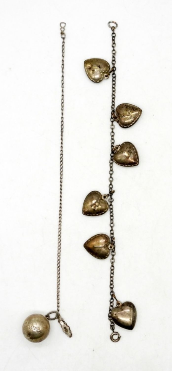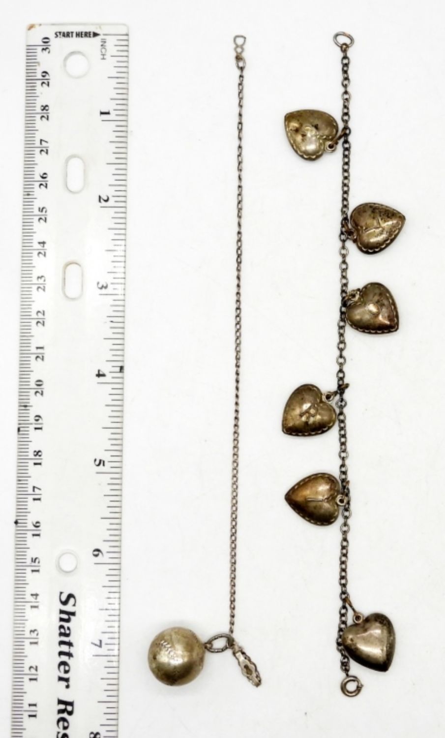 ANTIQUE STERLING SILVER CHAIN BRACELETS WITH CHARMS, BASEBALL (STAMPED BEAU STERLING) & HEARTS STAMPED STERLING; 7.5″ LENGTHS; 8.5 DWT