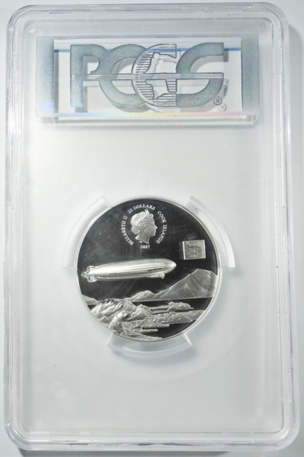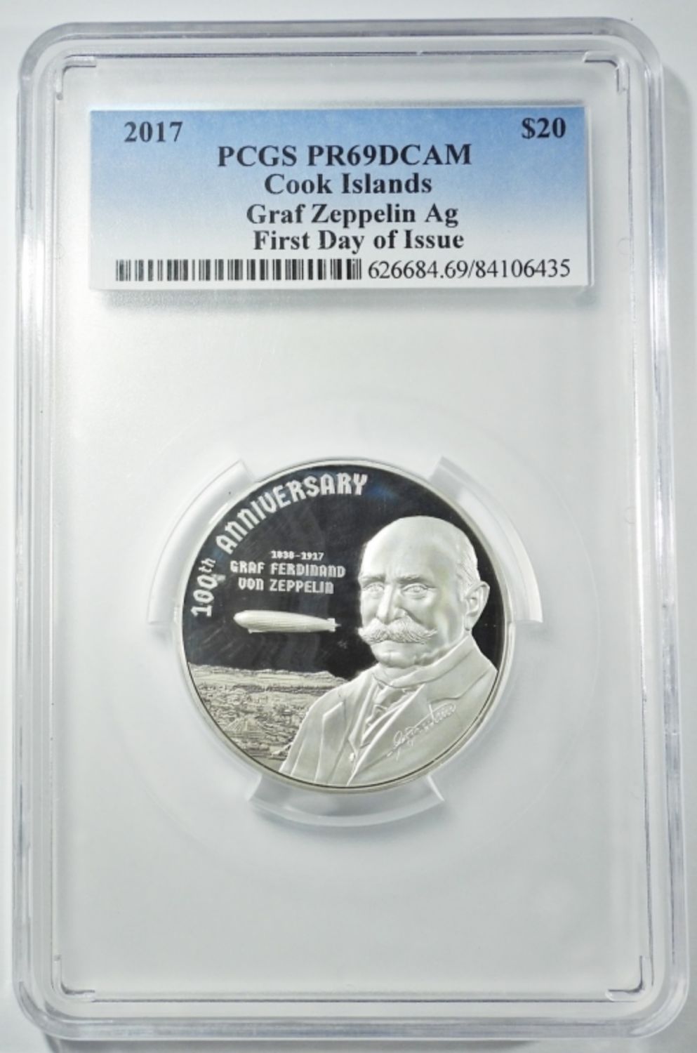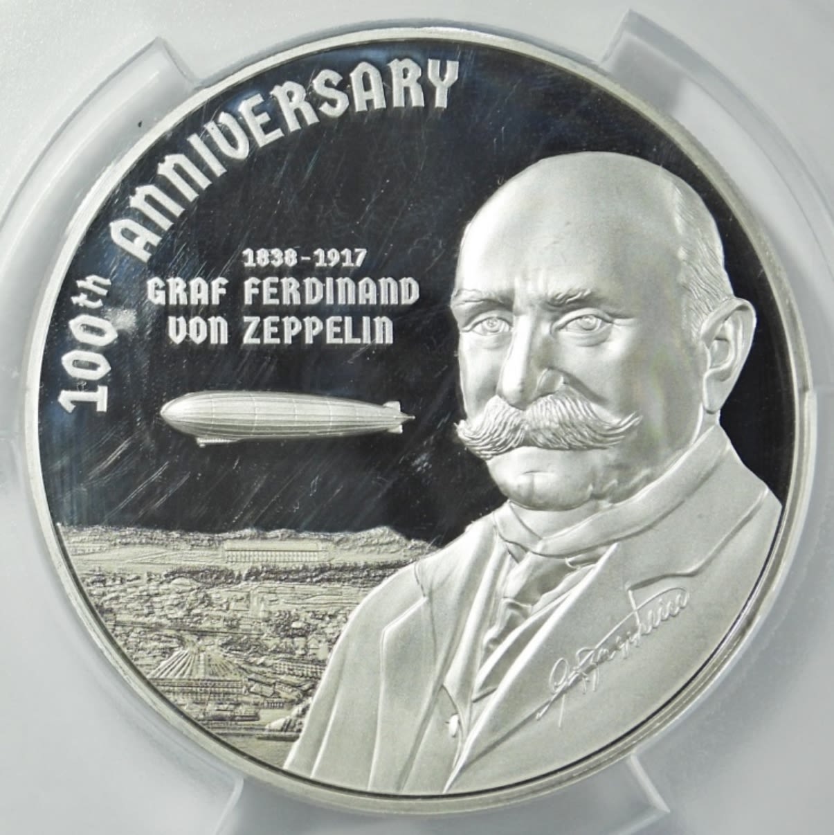 FIRST DAY OF ISSUE, GRAF ZEPPELIN SILVER. 3oz .999 SILVER WITH SWATCH OF AIRSHIP FABRIC.