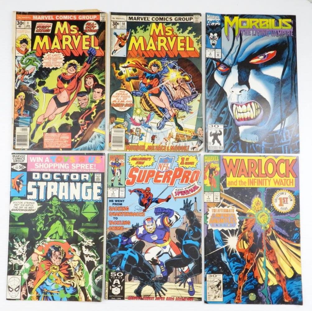 WARLOCK and the INFINITY WATCH #1, NFL SUPERPRO #1, MORBIUS #2, DOCTOR STRANGE #43 – ALL NICE FINE/VF & #10 MS MARVEL TORN