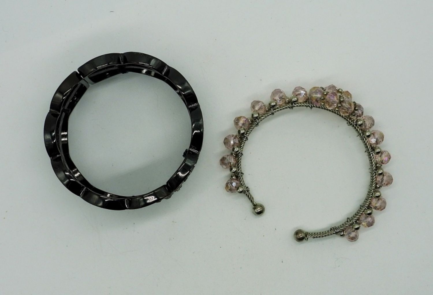 Wide, Gunmetal & Rhinestone Bangle Bracelet and Silver Wire Wrapped Cuff with Light Pink Beading.