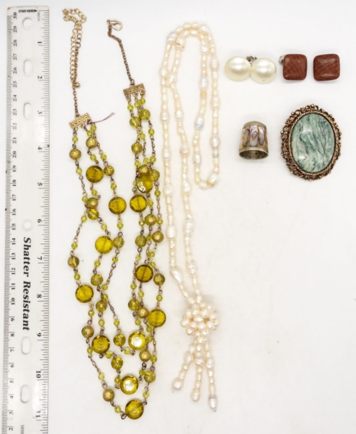 (2) PAIRS OF CLIP-ON EARRINGS, (2) NECKLACES, (1) BROOCH PIN, (1) ANTIQUE THIMBLE; FAUX PEARL, ABALONE, NATURAL STONE & GEMSTONES