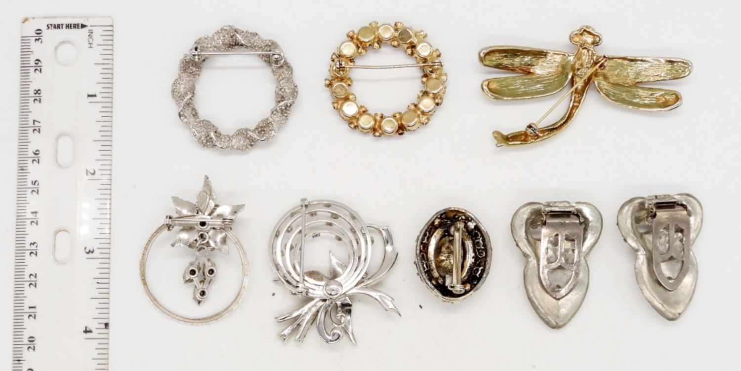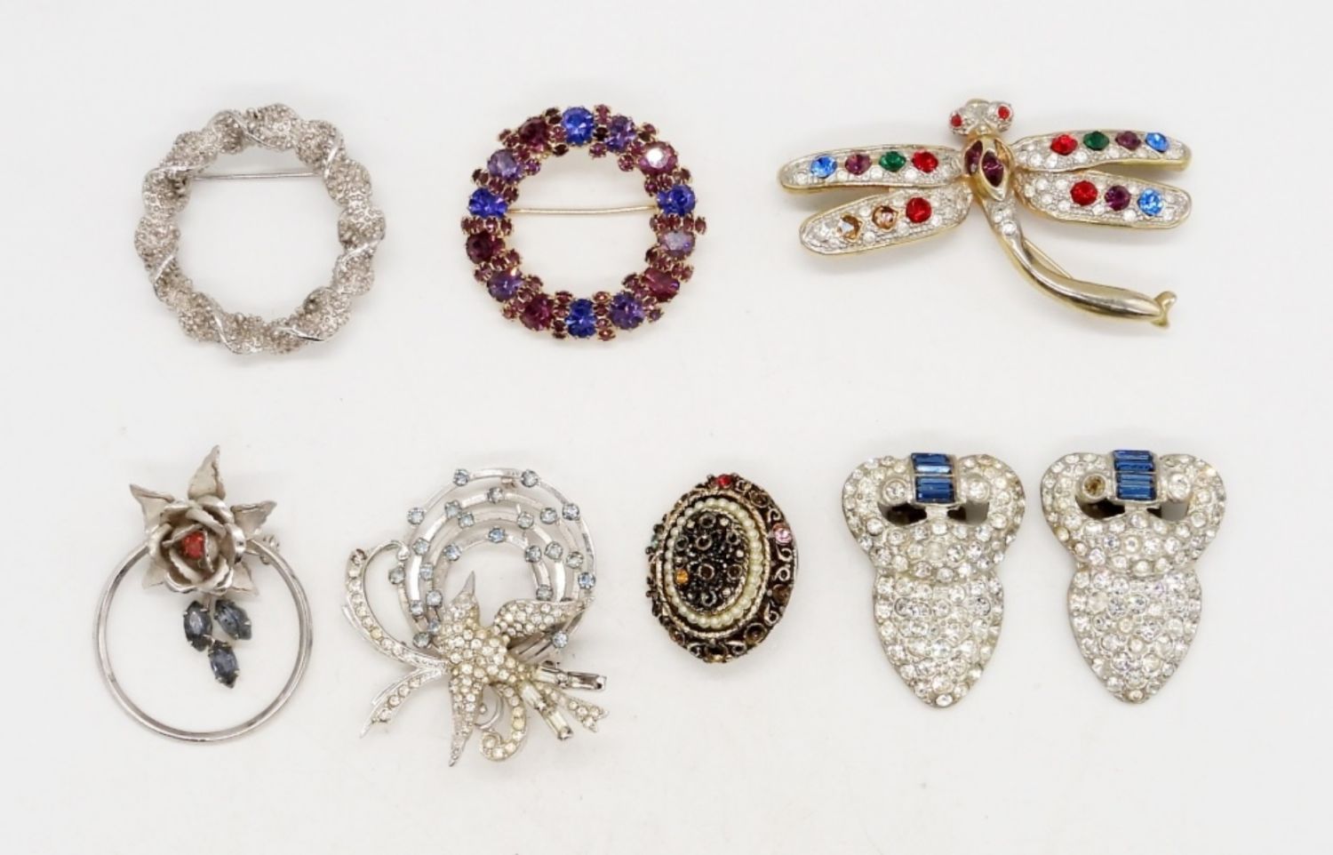GOLD & SILVER TONE BROOCH PINS WITH MULTI COLORED RHINESTONES, CLIP ON EARRINGS WITH RHINESTONES