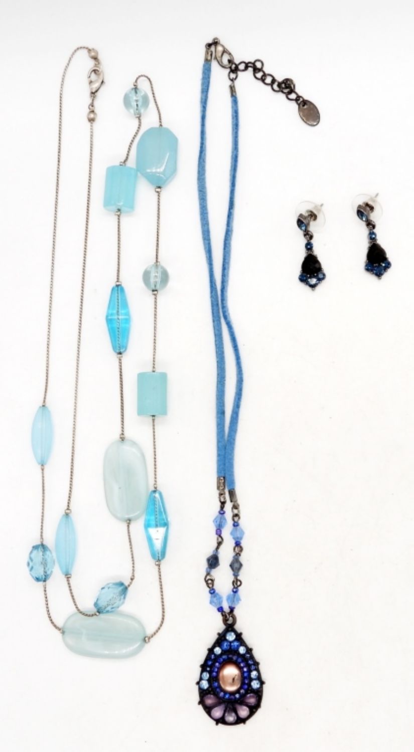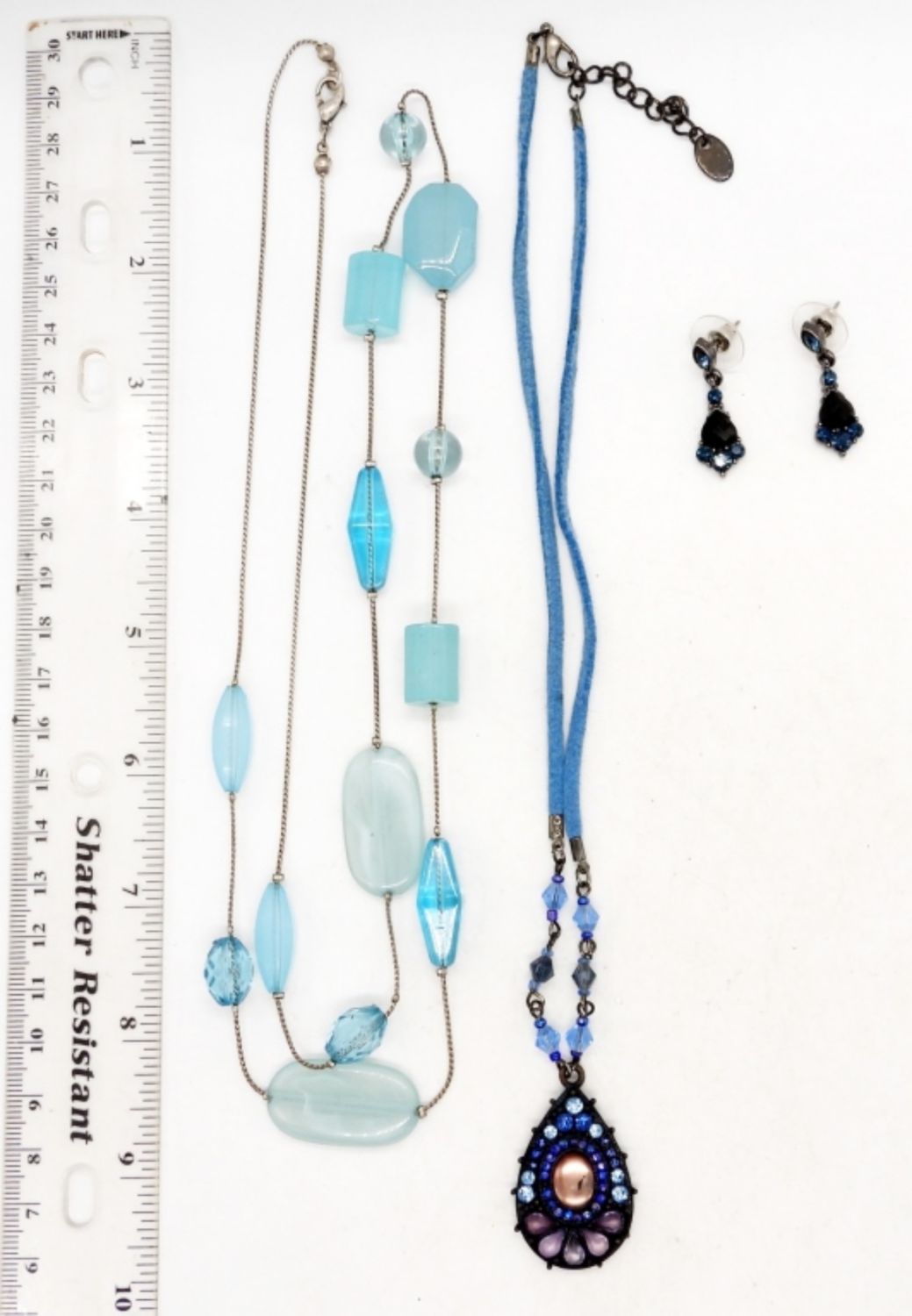 18″ CHOKER WITH LEATHER BAND, PENDANT WITH GEMSTONES; 36″ CHUNKY BEADED NECKLACE WITH BLUE NATURAL STONES, EARRINGS WITH BLUE GEMSTONES