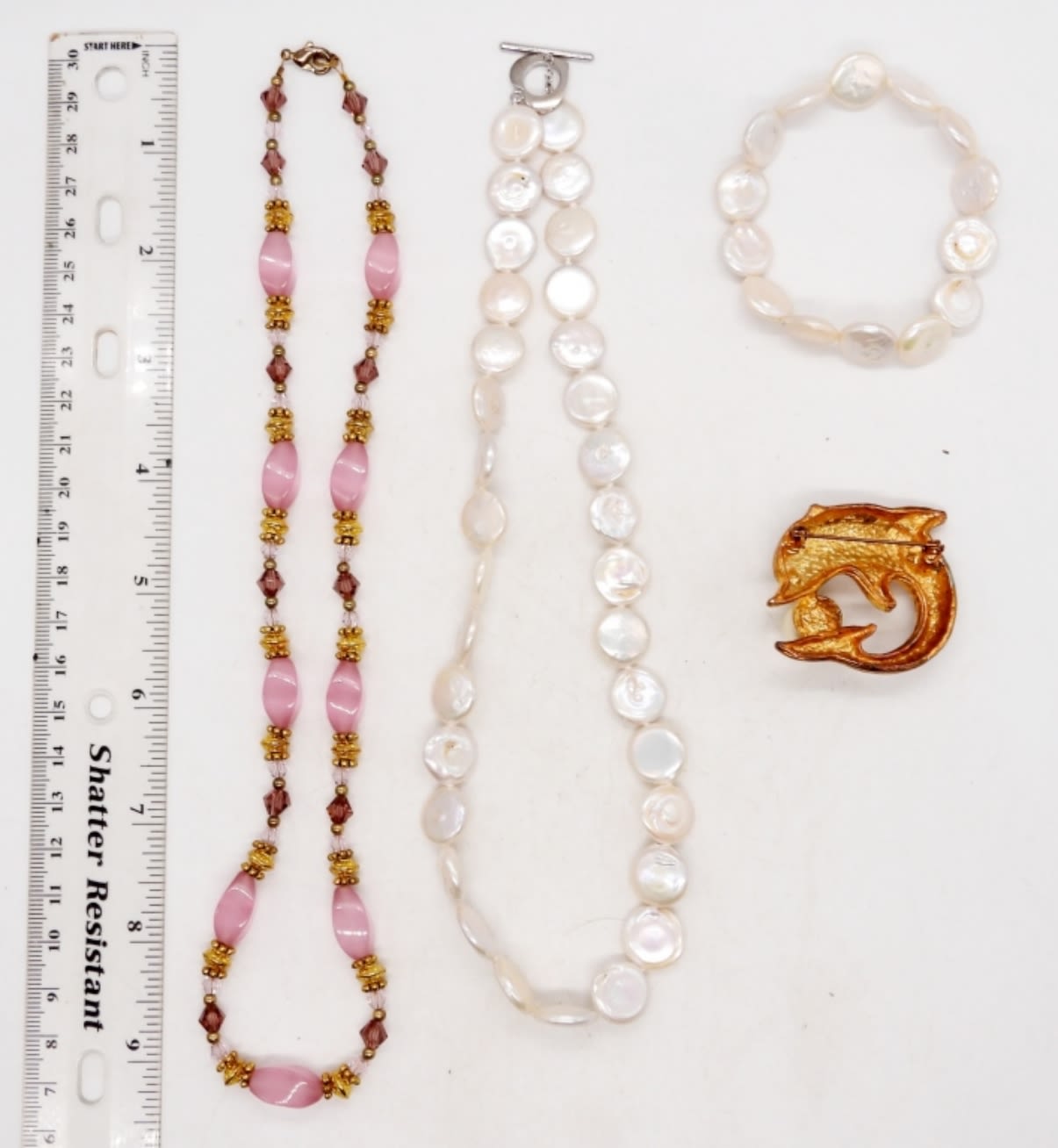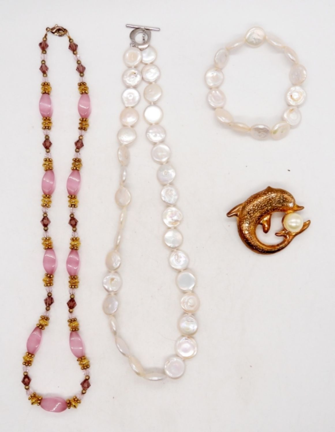 (2) 18″ NECKLACES, (1) STRETCHY STYLE BRACELET, AND (1) DOLPHIN BROOCH PIN; FAUX IRIDESCENT PEARLS, NATURAL STONE BEADS