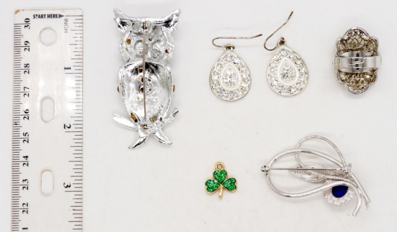 (2) BROOCHES, BLUE GEMSTONES & NATURAL STONE; (1) PAIR OF EARRINGS WITH CLEAR GEMSTONES; (1) RING WITH GREEN GEMSTONES & ORNATE DESIGN – SIZE 7 ADJUSTABLE; (1) PENDANT SPARKLY GREEN FOUR LEAF CLOVER