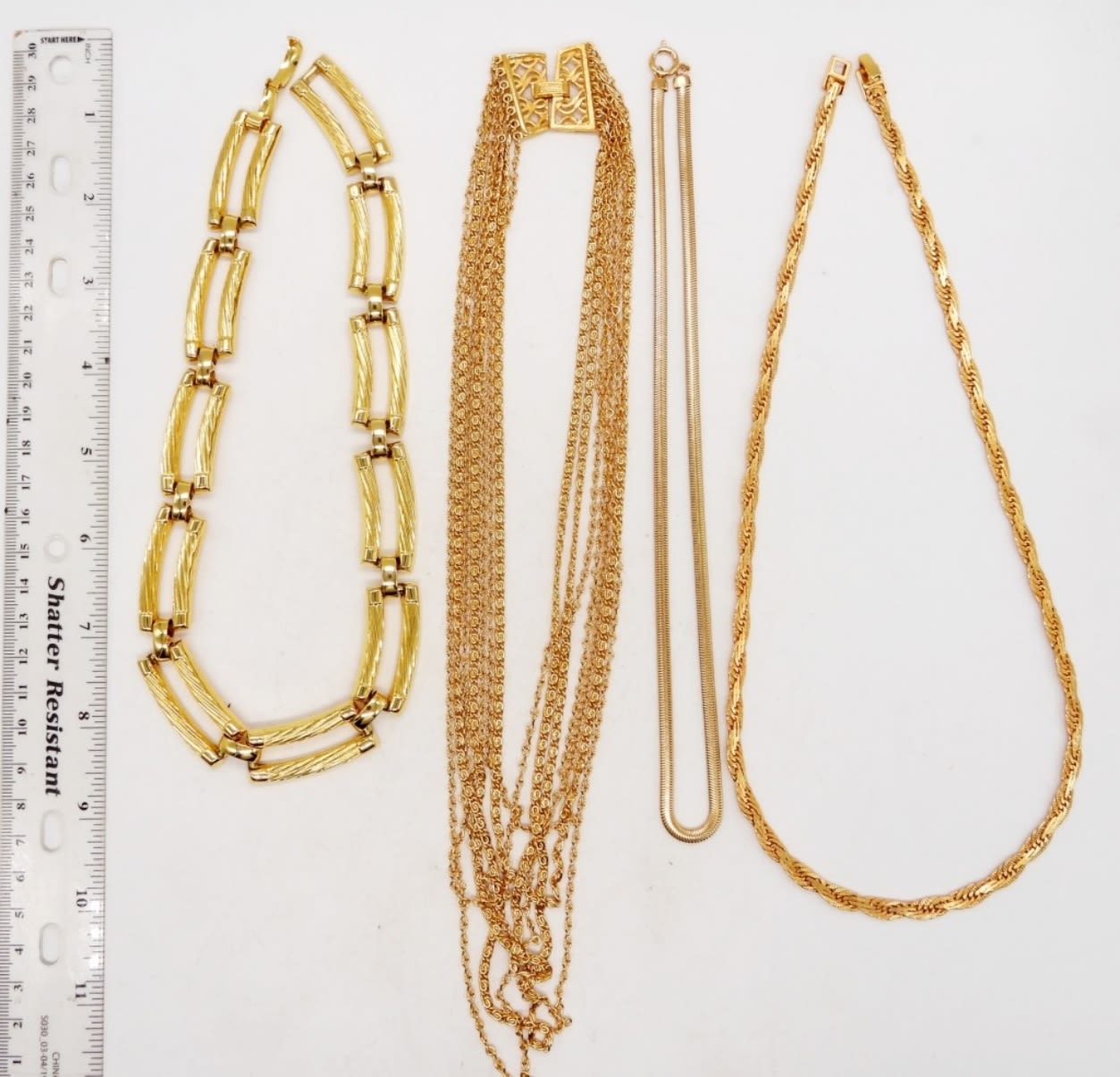 ALL DIFFERENT DESIGNS & VARIOUS LENGTHS, GOLD TONE NECKLACES – (1) IS STAMPED “TRIFARI”