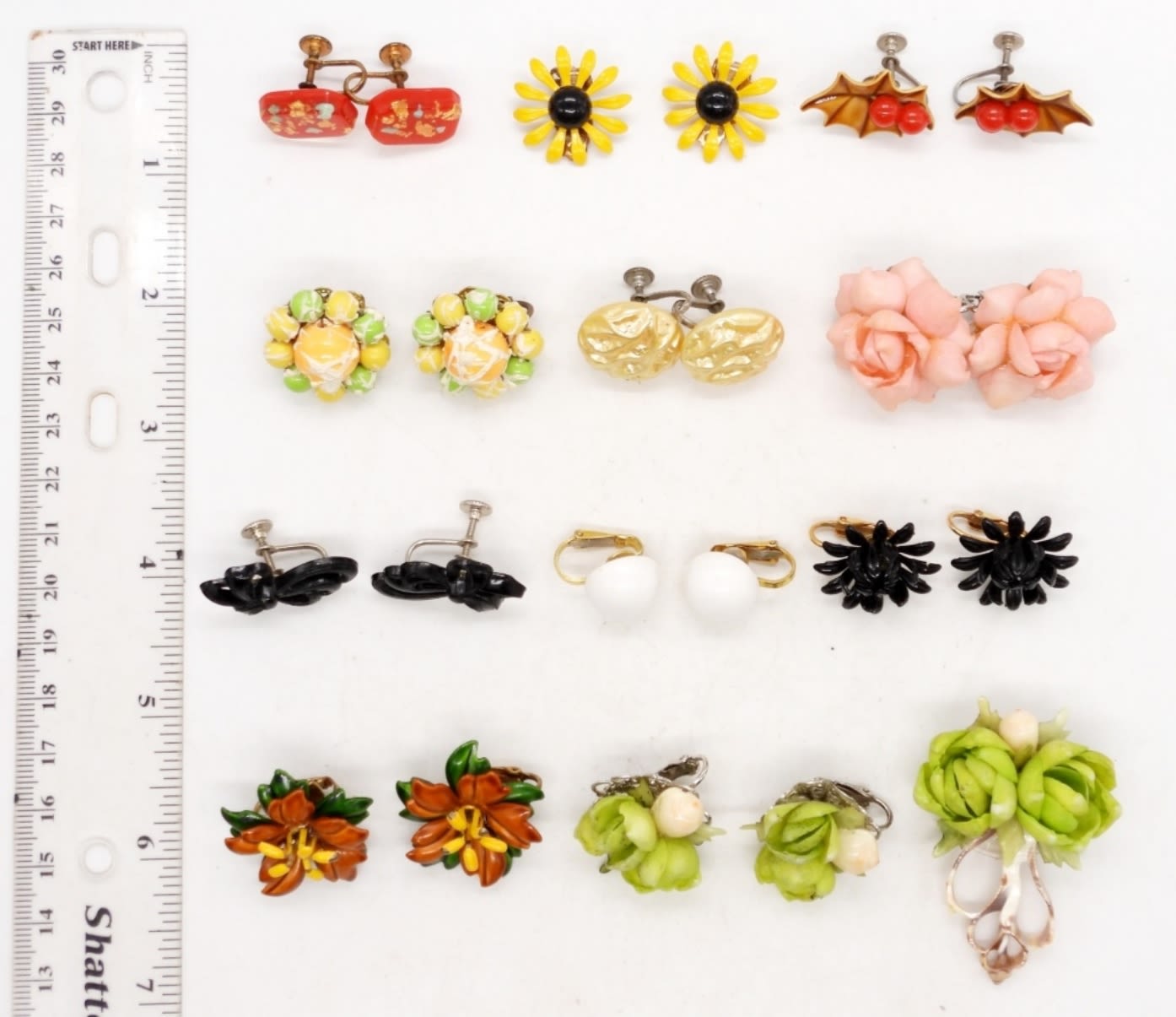 (1) BROOCH PIN WITH CUT SEASHELL UNIQUE DESIGN; (11) PAIRS OF CLIP-ON & SCREW BACK EARRINGS – ALL DIFFERENT FLOWER & BUTTON DESIGNS