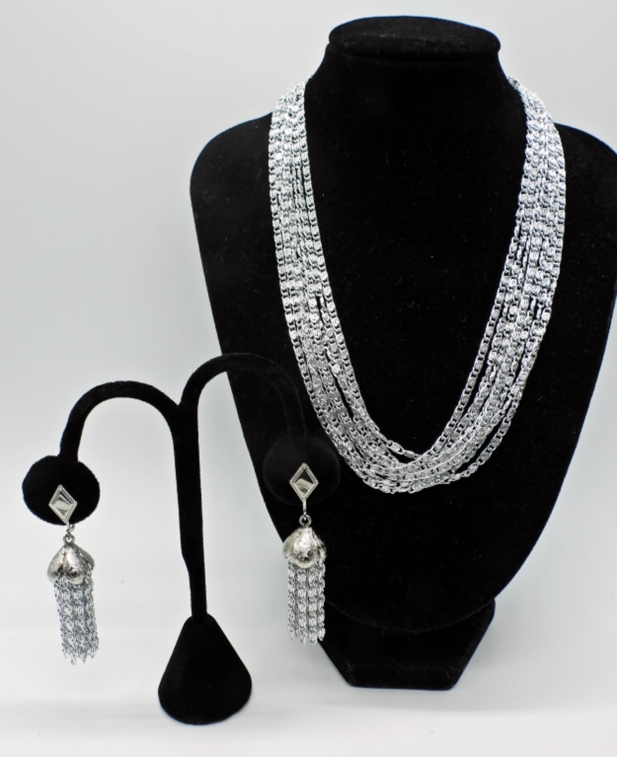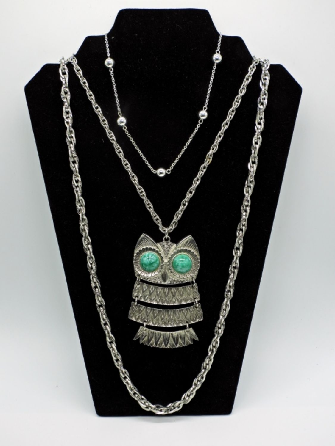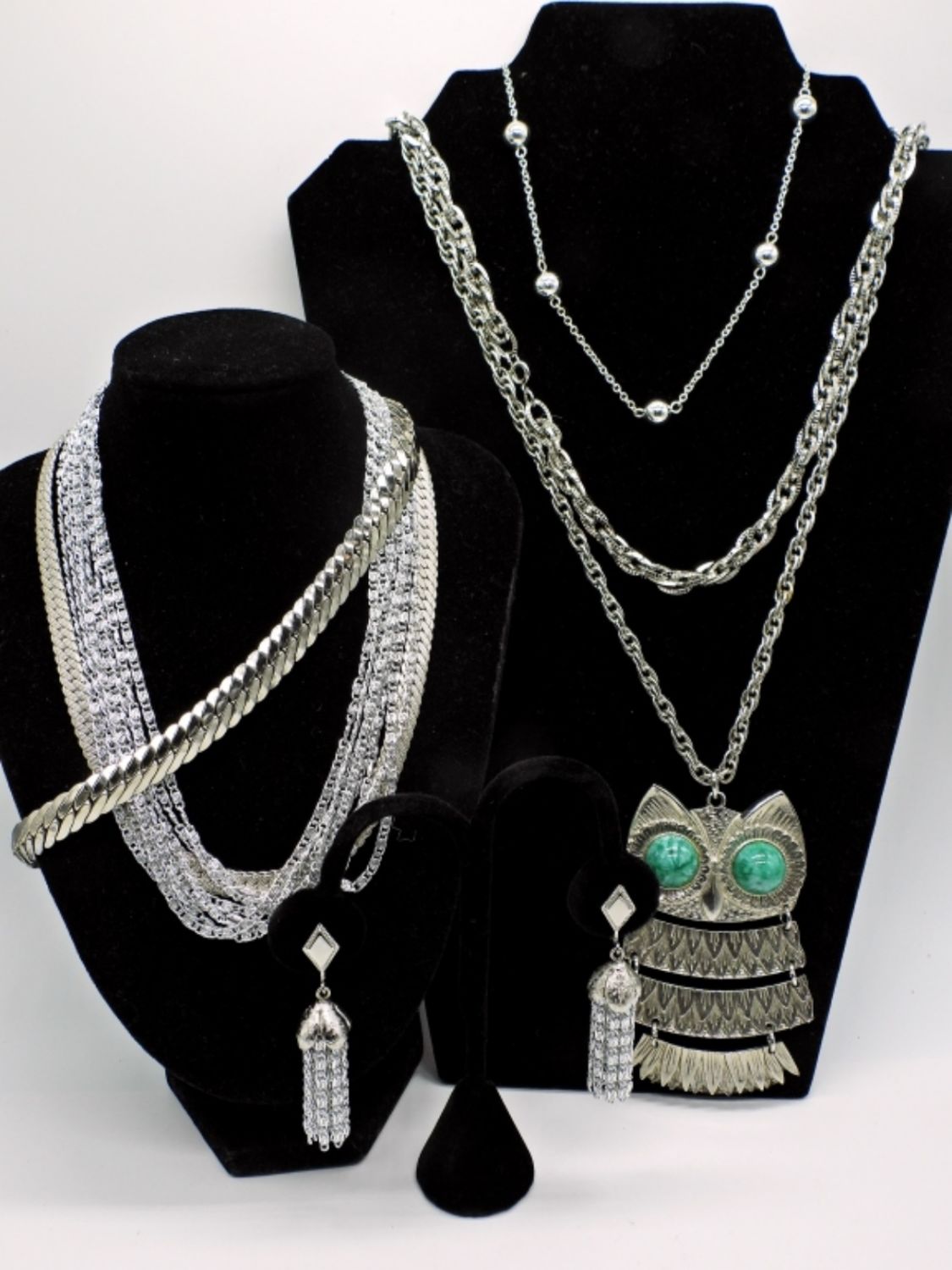 Sarah Coventry necklace and matching earrings, plus Monet necklace, Chaps, and owl pendant in various lengths 15-28 inches. 6 necklaces total and one pair earrings. In fine condition.