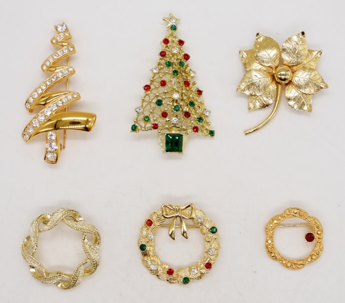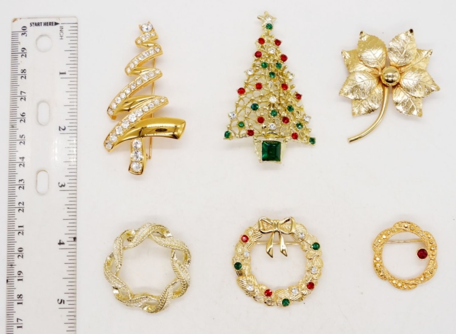 GOLD TONE BEAUTIFUL CHRISTMAS BROOCHES WITH RED, GREEN & CLEAR GEMSTONES – (1) STAMPED “MONET”