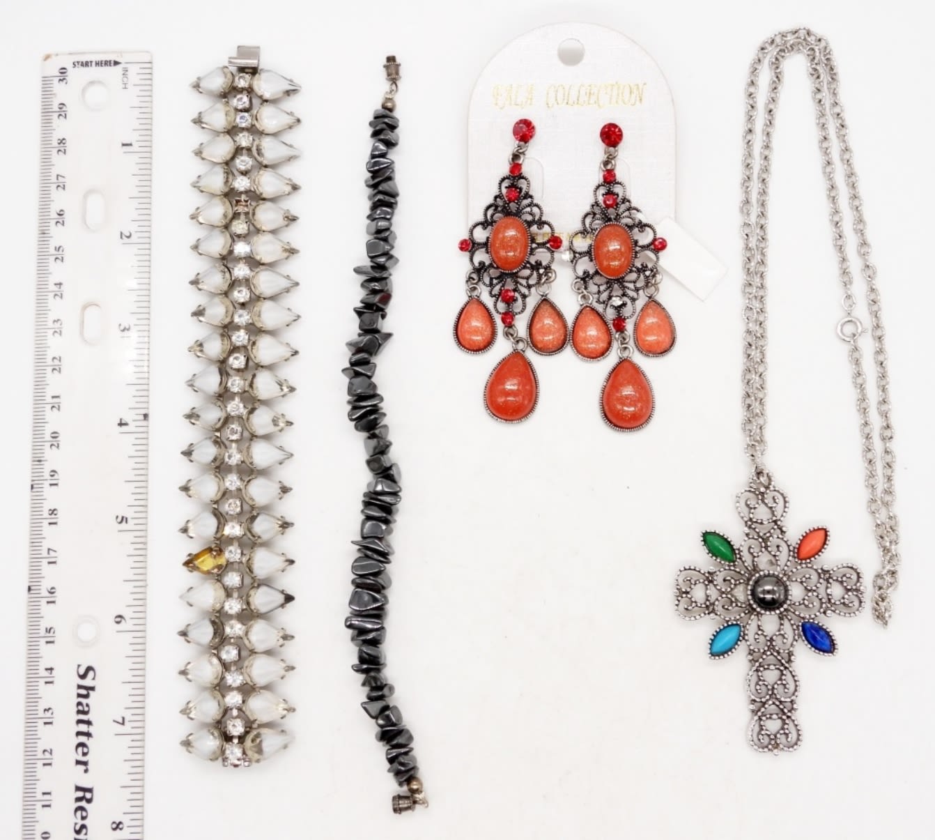(2) 8″ BRACELETS; (1) NECKLACE WITH LARGE CROSS PENDANT; (1) PAIR OF EARRINGS; LARGE NATURAL STONES & HEMATITE; (1) STAMPED “AVON”, (1) STAMPED “KRAMER”; (1- BEAD MISSING FROM BRACELET)