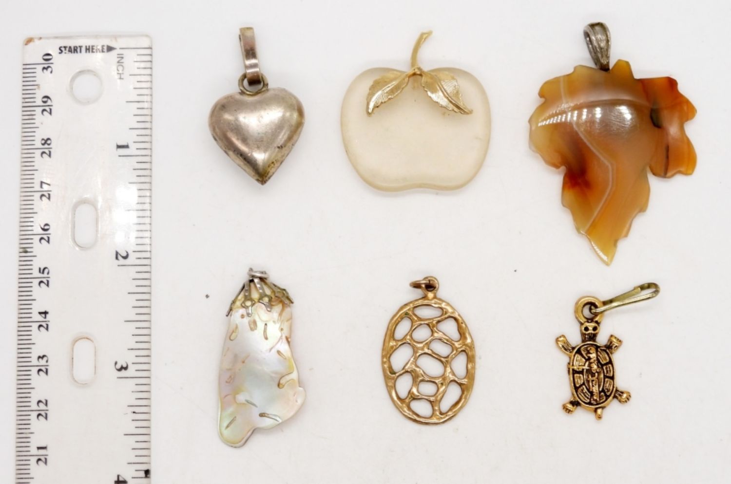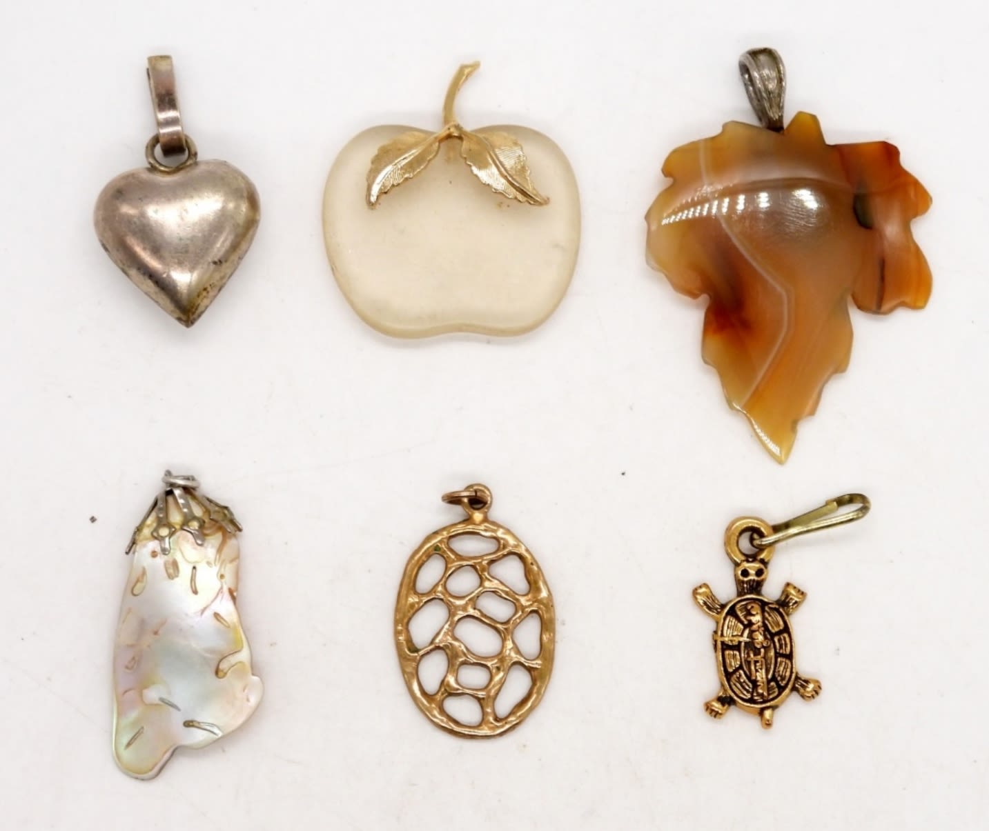 ALL DIFFERENT – GOLD TONE, CARVED NATURAL STONE, SEASHELL, GLASS APPLE, TURTLE, HEART