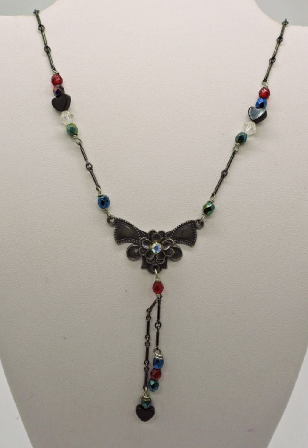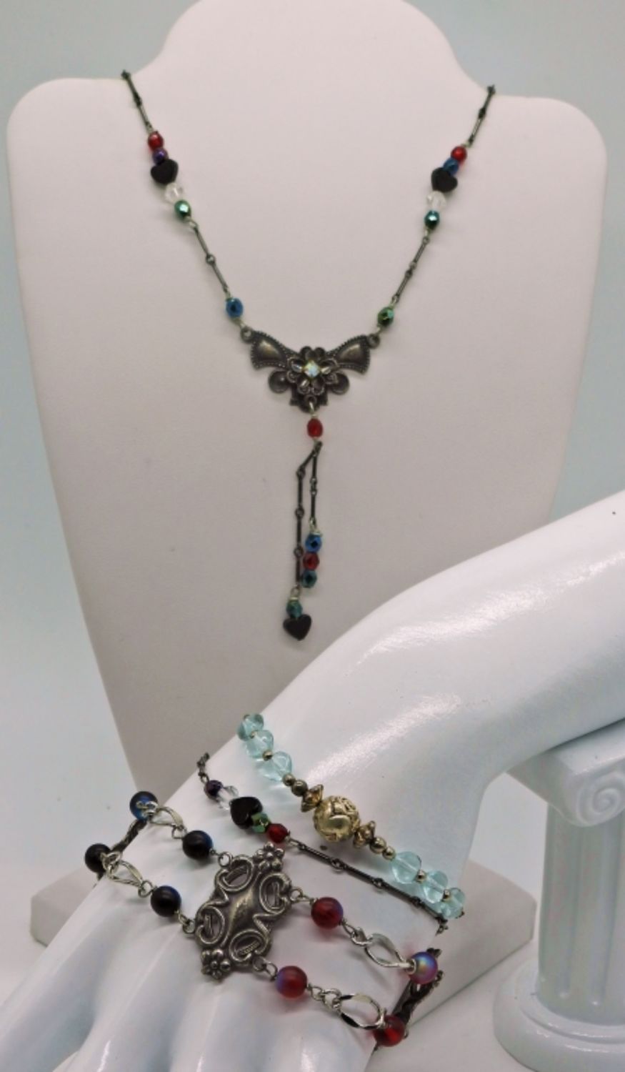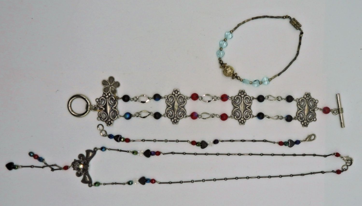Silver Tone Black and Red Beaded Necklace with 2 matching Bracelets. One Silver tone & Light Blue Beaded Bracelet.