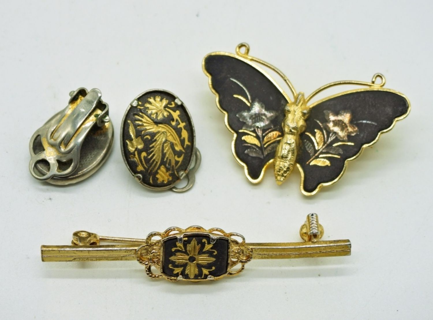 Gold Tone Butterfly Pin, Lapel Pin, Clip On Earrings and Two Bracelets.
