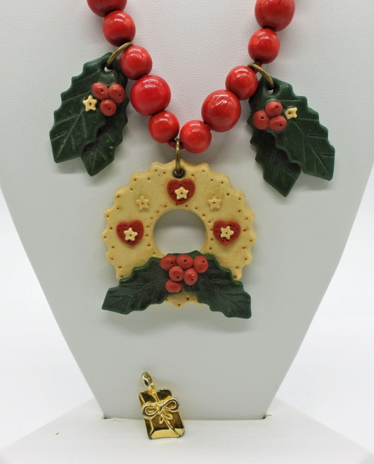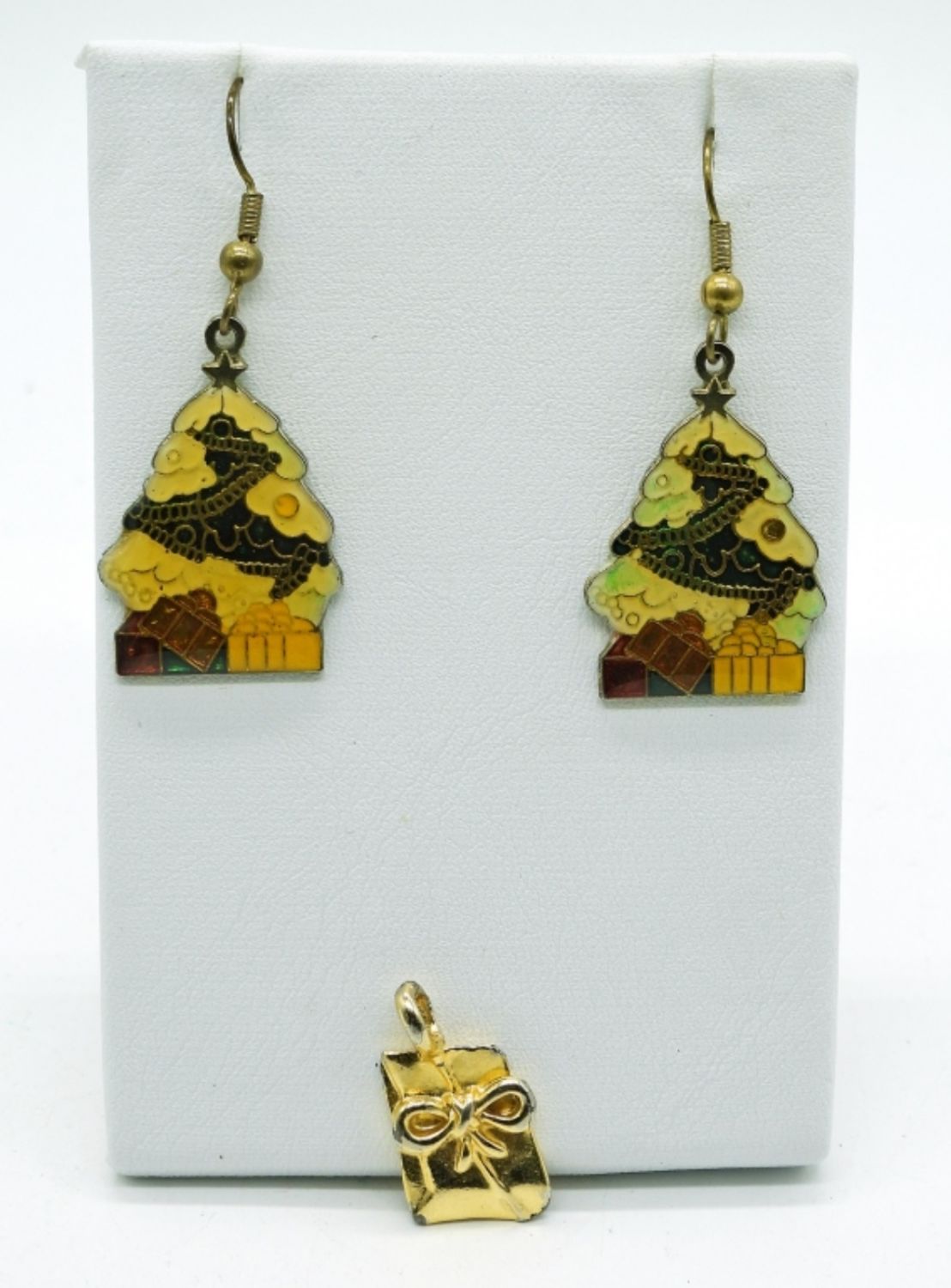 Christmas Jewelry, 26 inch Craft Necklace, Christmas Tree Pierced Earrings and a Gold Tone Present Charm.